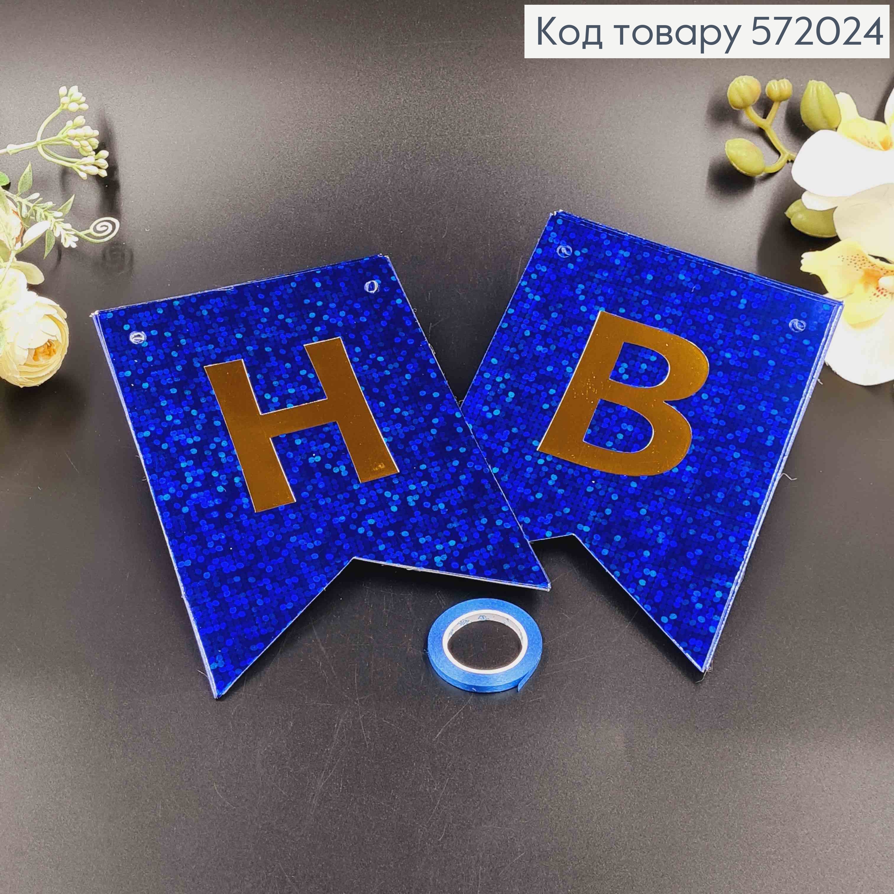 Гірлянда паперова, "Happy Birthday" Синього кольору, з голографічним візерунком 17*12см