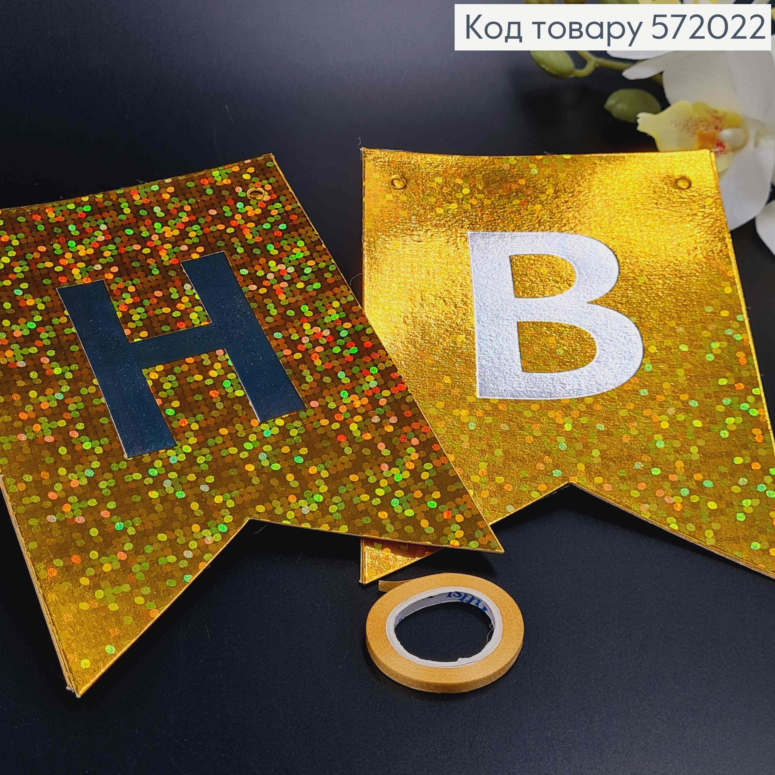 Гірлянда паперова, "Happy Birthday" Золотого кольору, з голографічним візерунком 17*12см