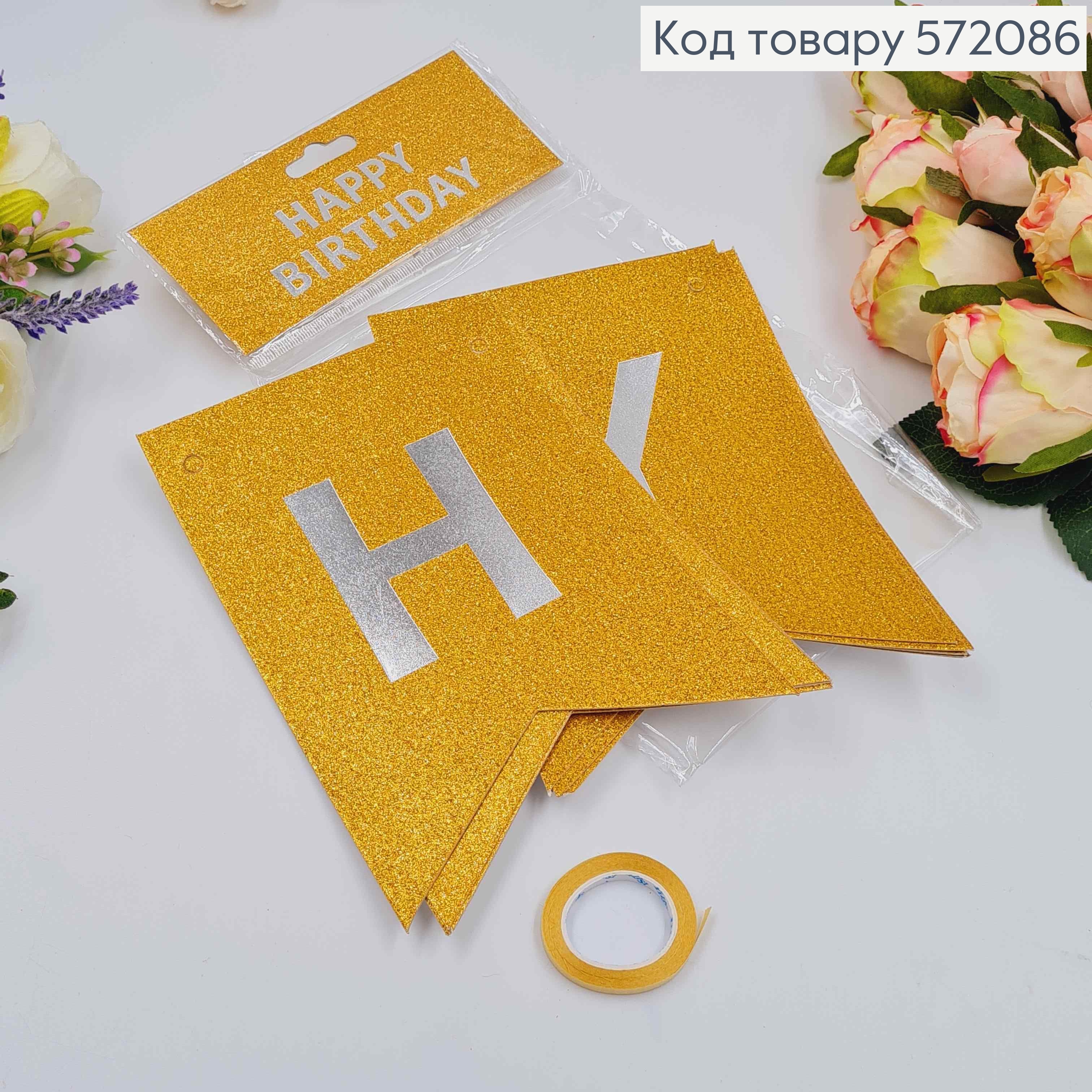 Гірлянда паперова, "Happy Birthday" Жовтого кольору з блискітками, 17*12см