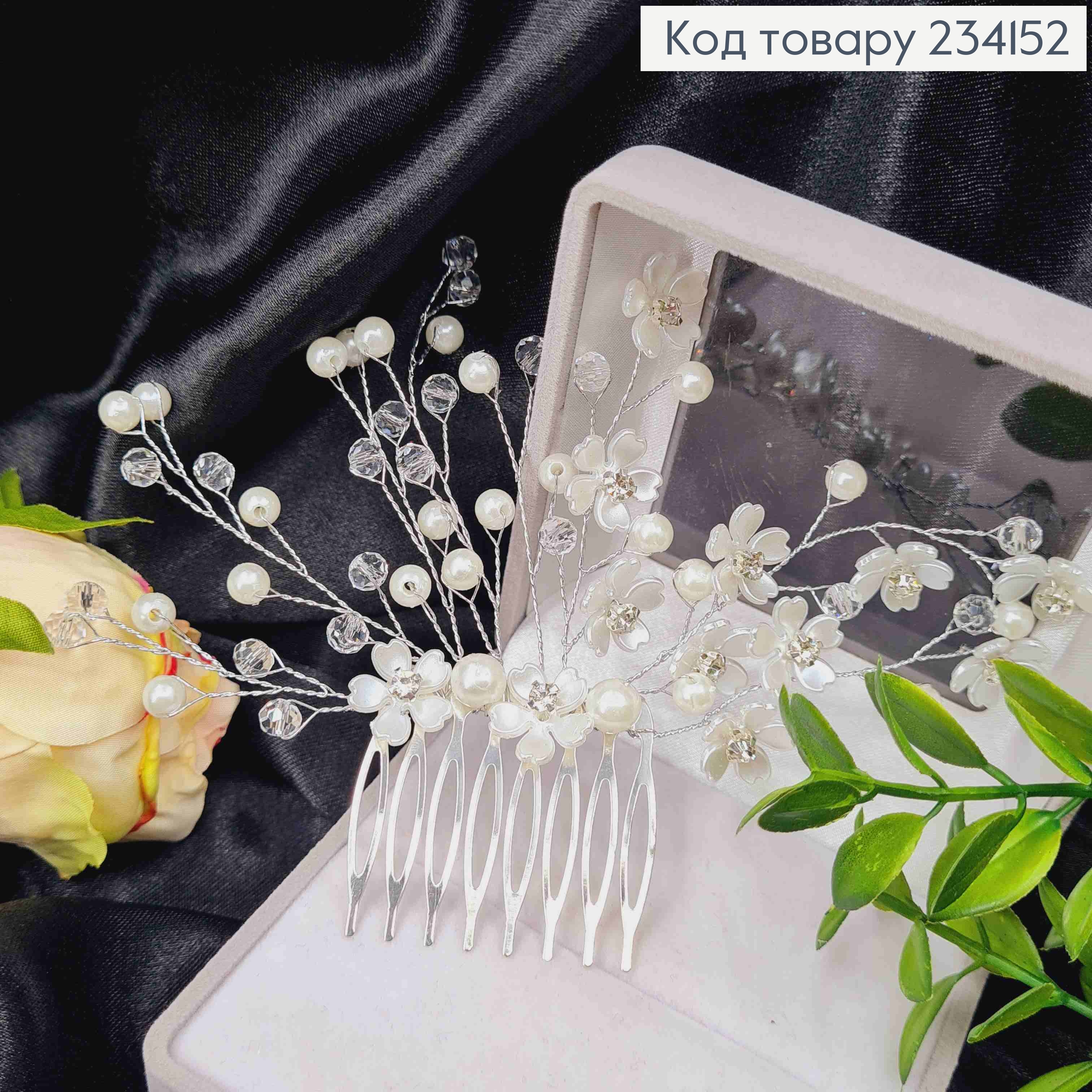 Гребінь у волосся, Ніжні квіточки з камінчиками та Перлинки, срібного кольору