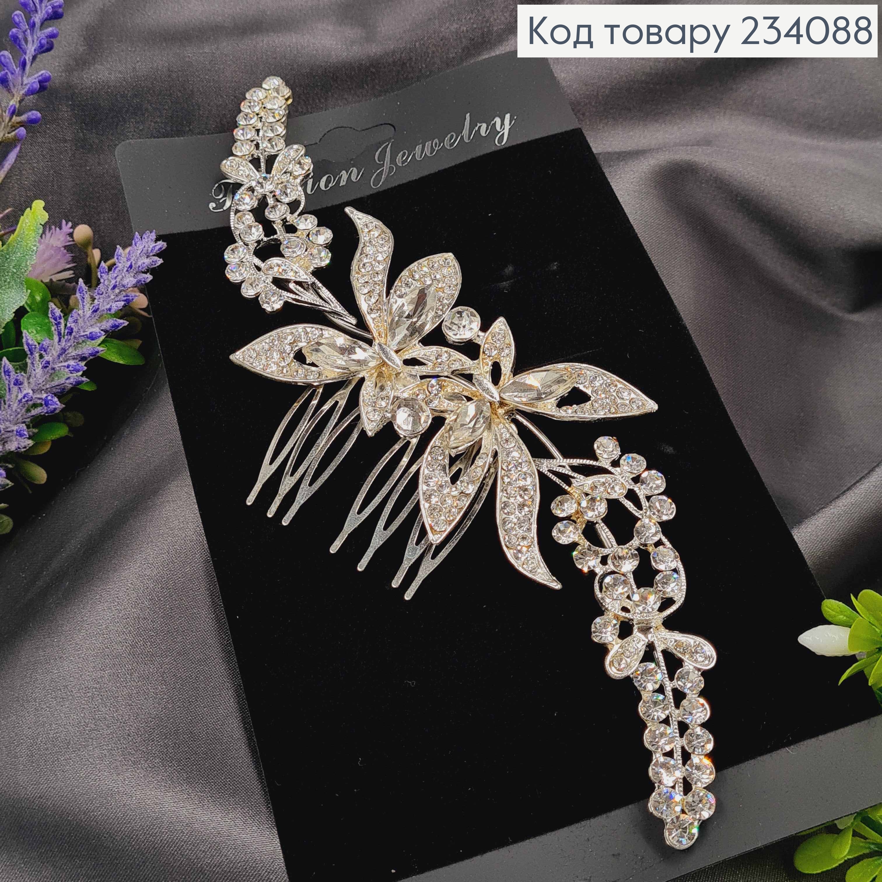 Гребень в волосы, серебряного цвета, две бабочки в цветах, в камнях, 19см