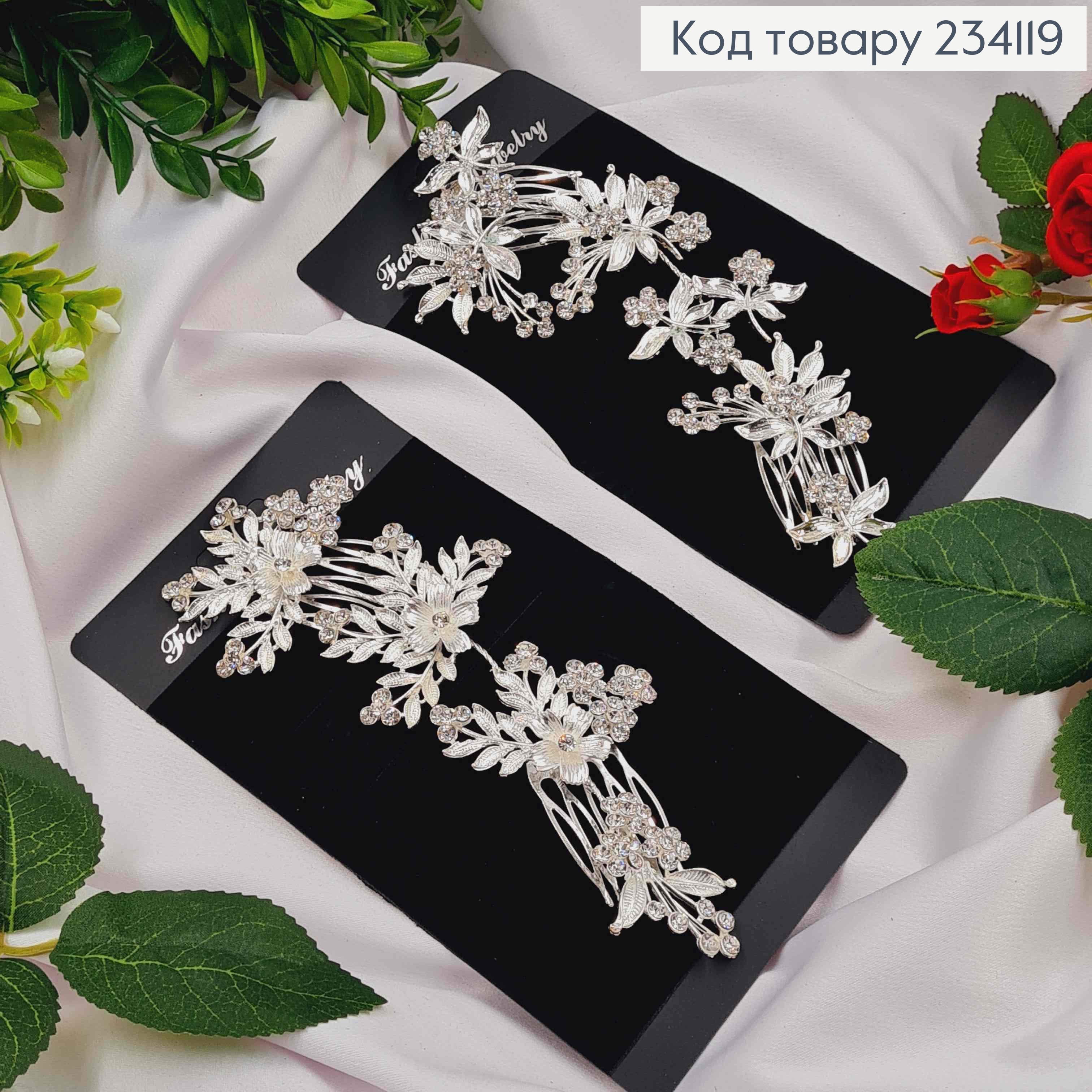Гребінь у волосся, срібного кольору, Маленькі квіти з листочками та камінцями, довжина 17,5см в асор