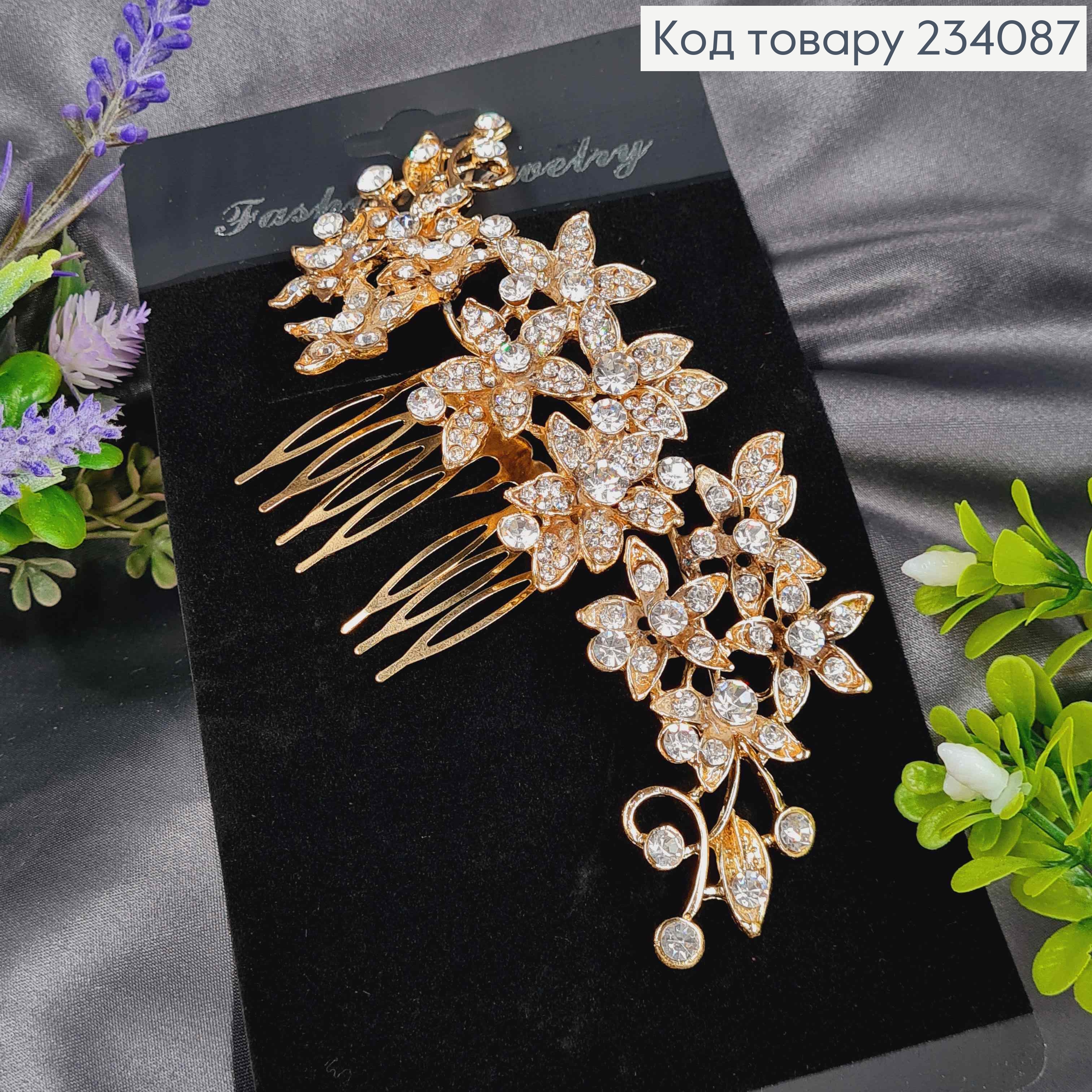 Гребінь у волосся, золотого кольору, переплетені квіти, в камінцях, 16см