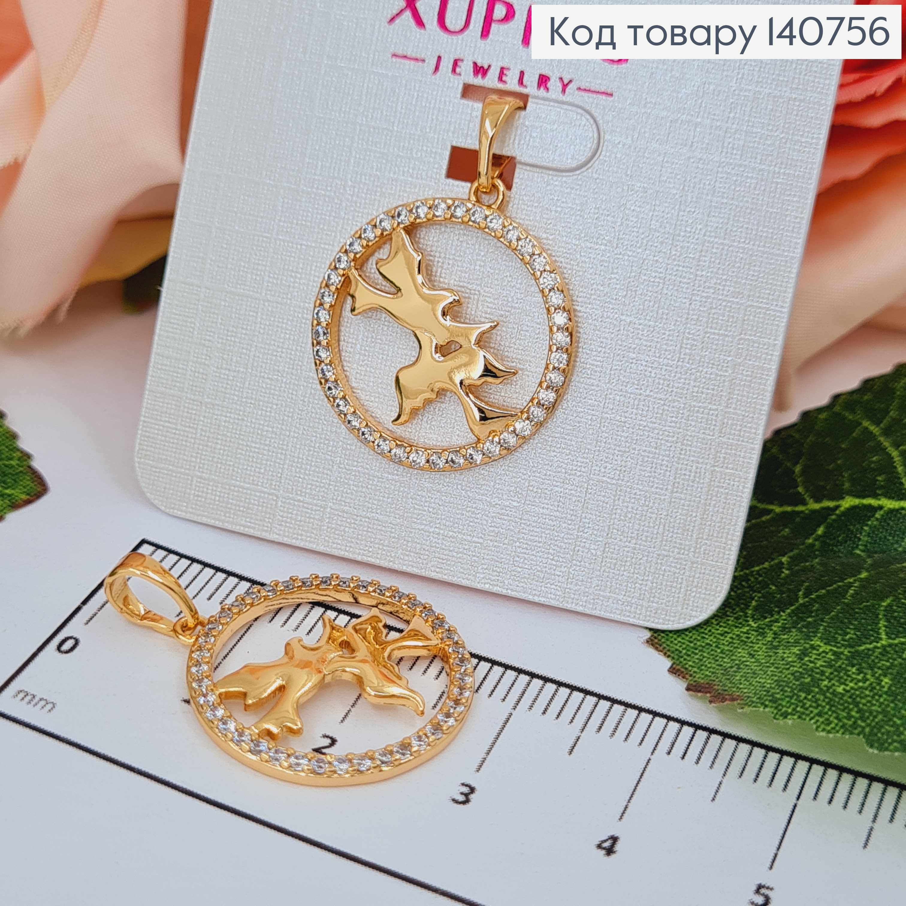 Кулон, "Голуби Миру" в круглій оправі, з камінців, 2см, Xuping 18K