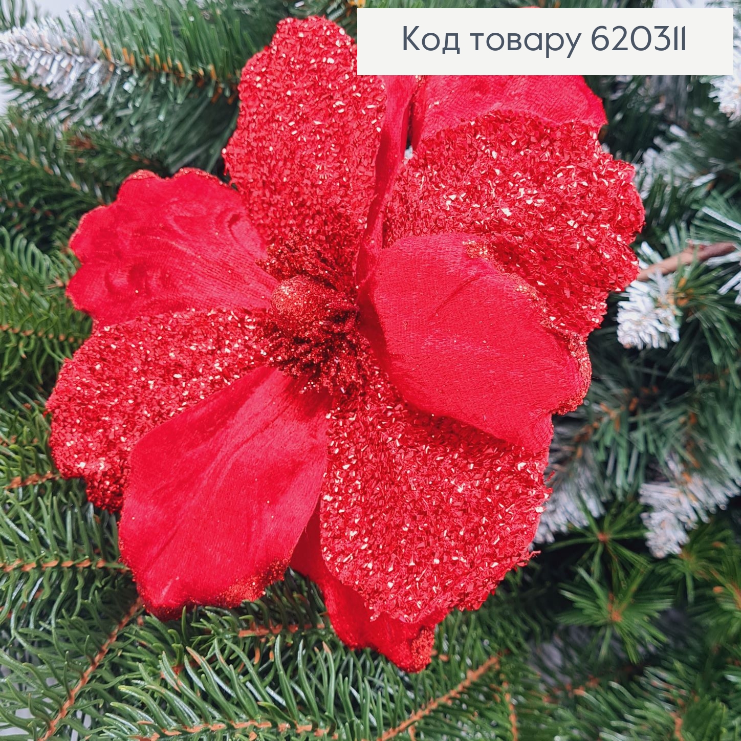 Квітка Різдвяна Магнолія глітер ЧЕРВОНА д.18см на металевому стержні 15 см