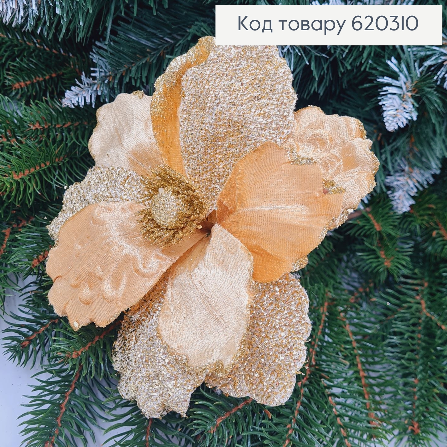 Квітка Різдвяна Магнолія глітер ЗОЛОТО д.18см на металевому стержні 15 см