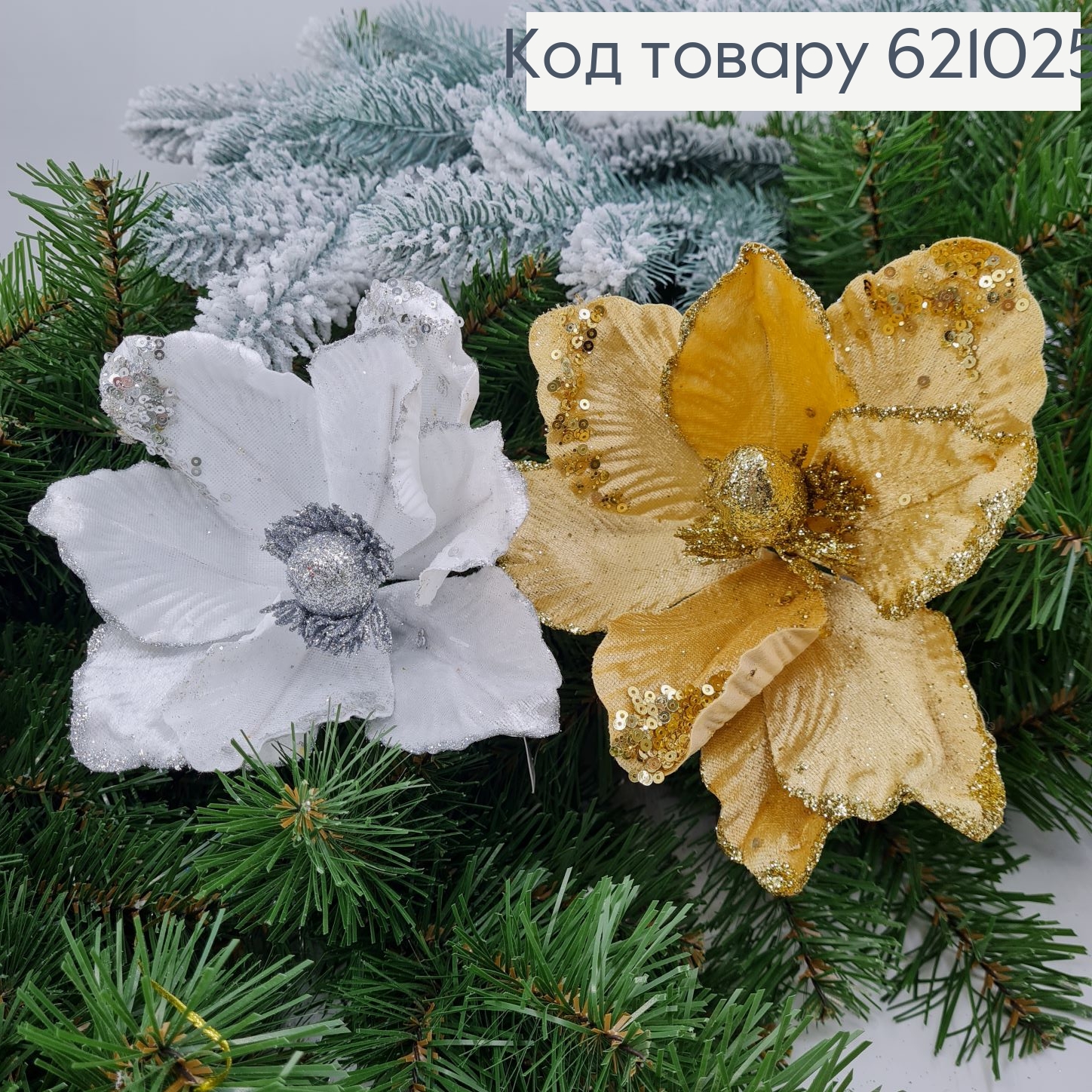 Квітка МАГНОЛІЇ, БІЛА+золото, діаметр 17-20см, на металевому стержні 20см, оксамитова 620731 фото