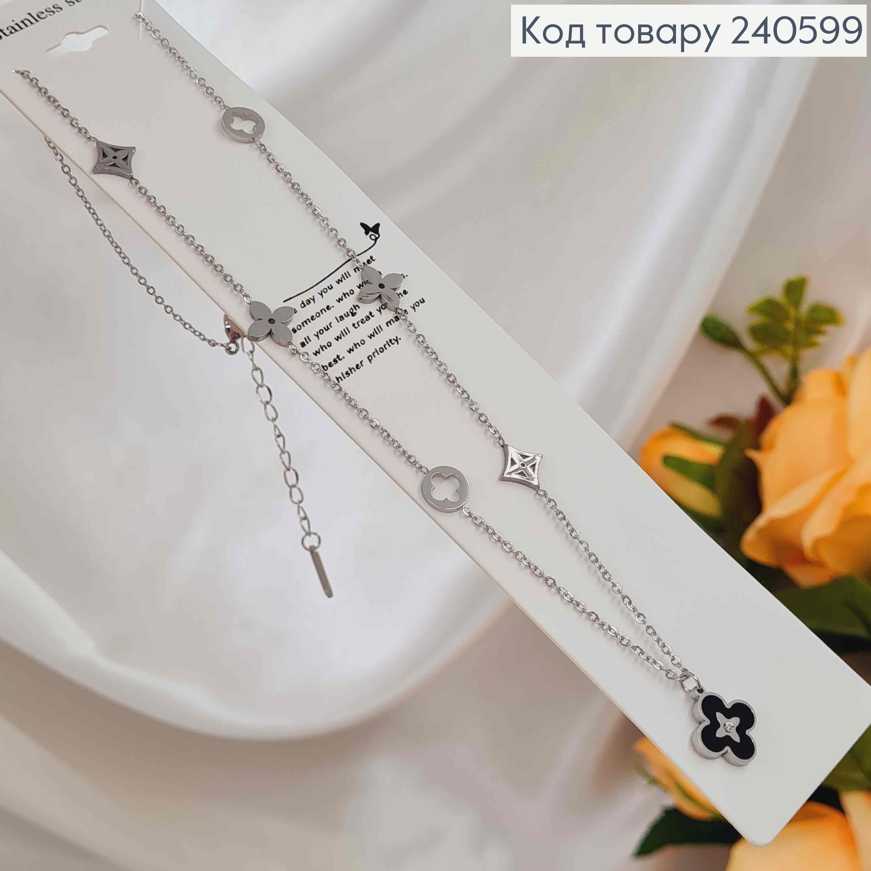 Ланцюжок срібного кольору, з підвісками Van Cleef з Чорною емаллю, 43+5см, сталь Stainless Steel 240760 фото