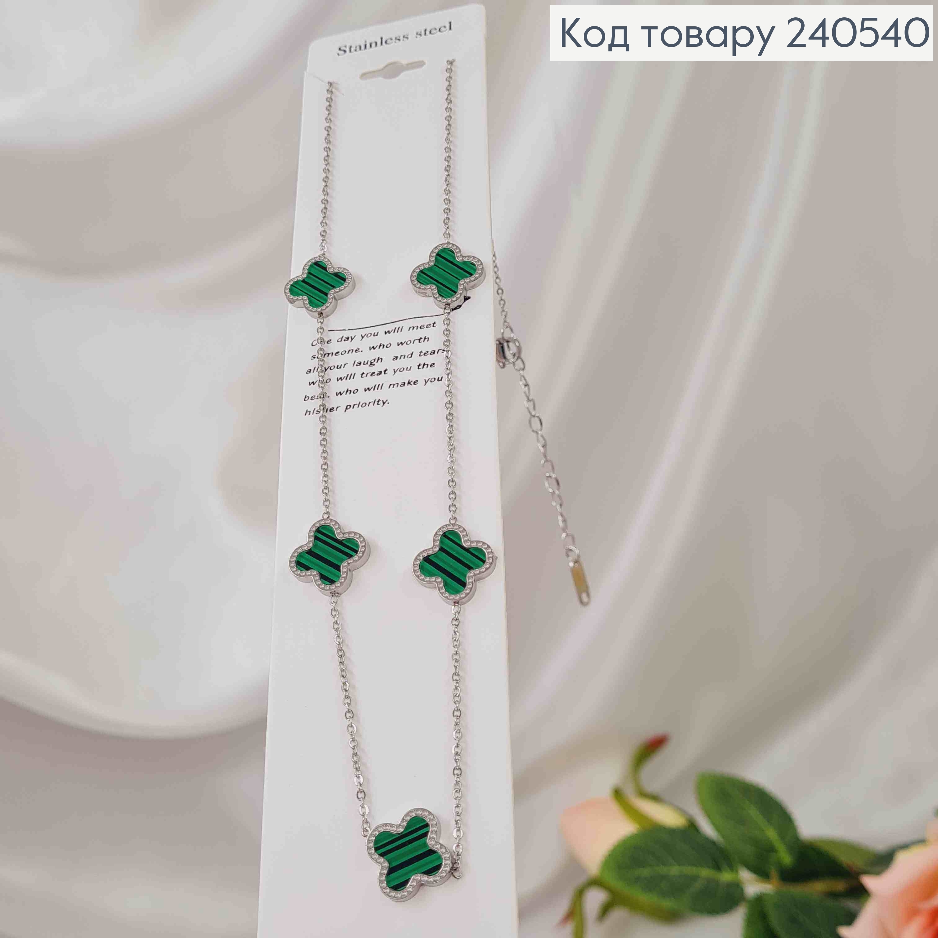 Ланцюжок срібного кольору, "Van Cleef" з зеленою емаллькою, 45+5см сталь Stainless Steel