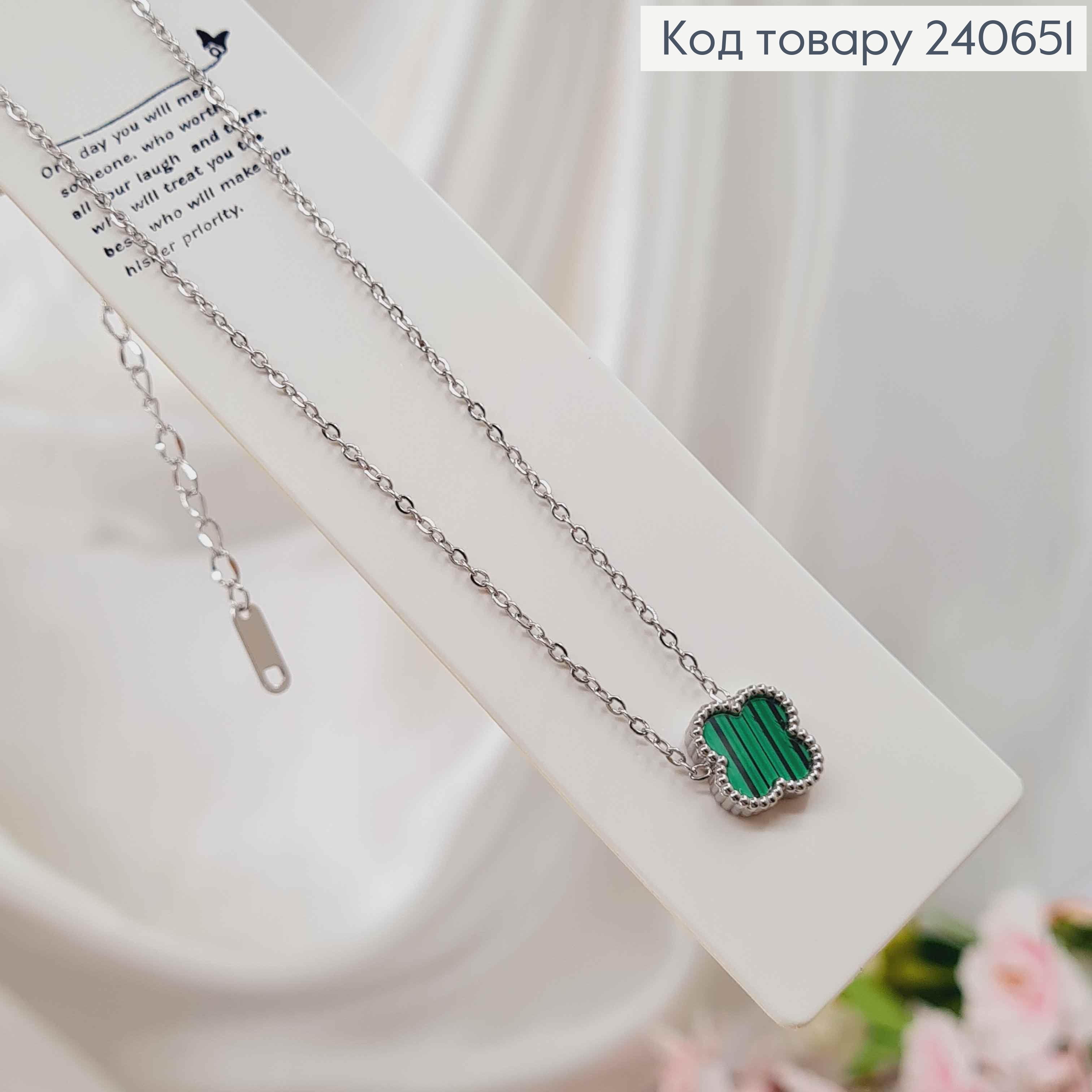Ланцюжок срібного кольору, "Van Cleef" з Зеленою емаллю, 42+6см, сталь Stainless Steel