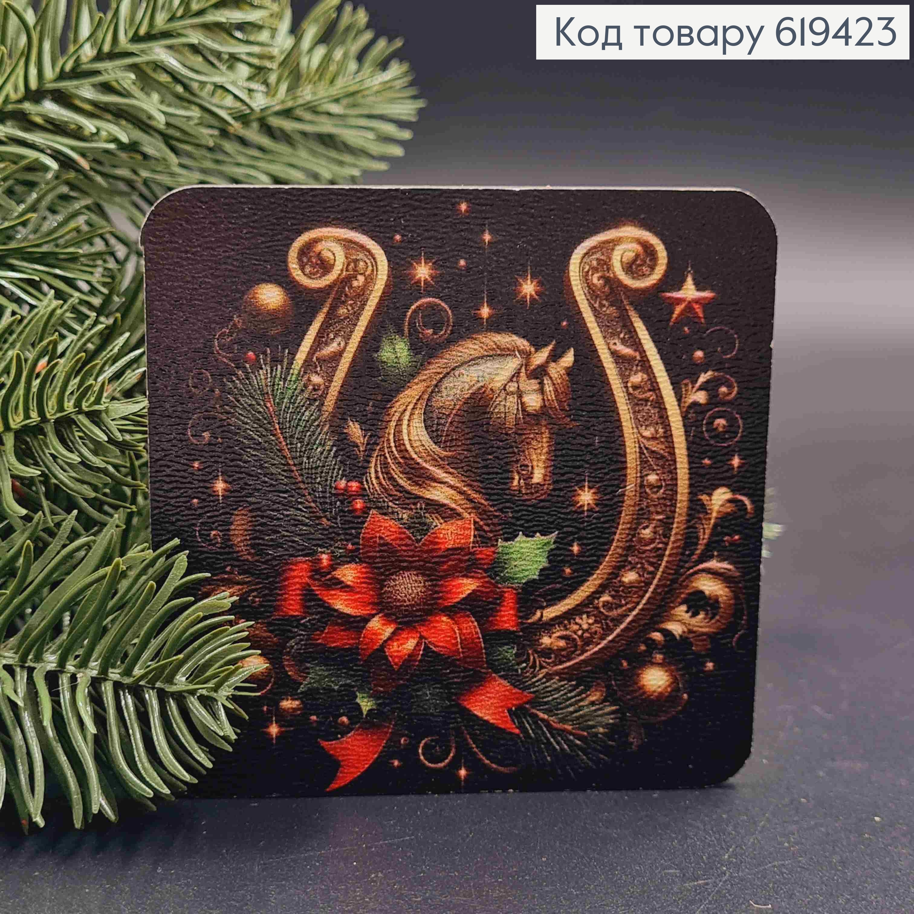Магніт з дерева з принтом "КІНЬ з ПІДКОВОЮ" на Чорному, 8*8см, ручна робота, Україна