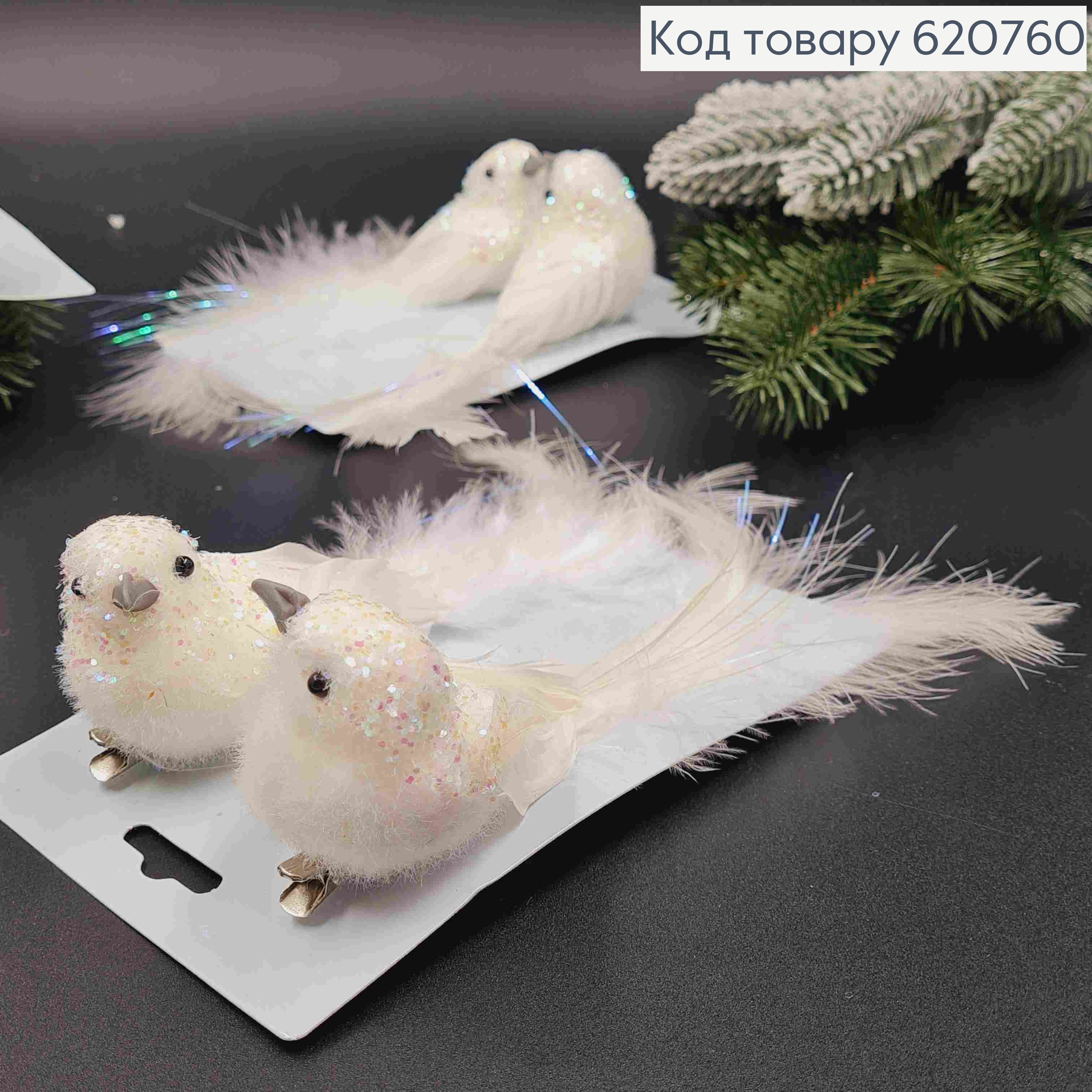 Набір (2шт) : ПТАШКА на заколці, БІЛОГО кольору+Блиск, 15см, новорічний декор 620758 фото