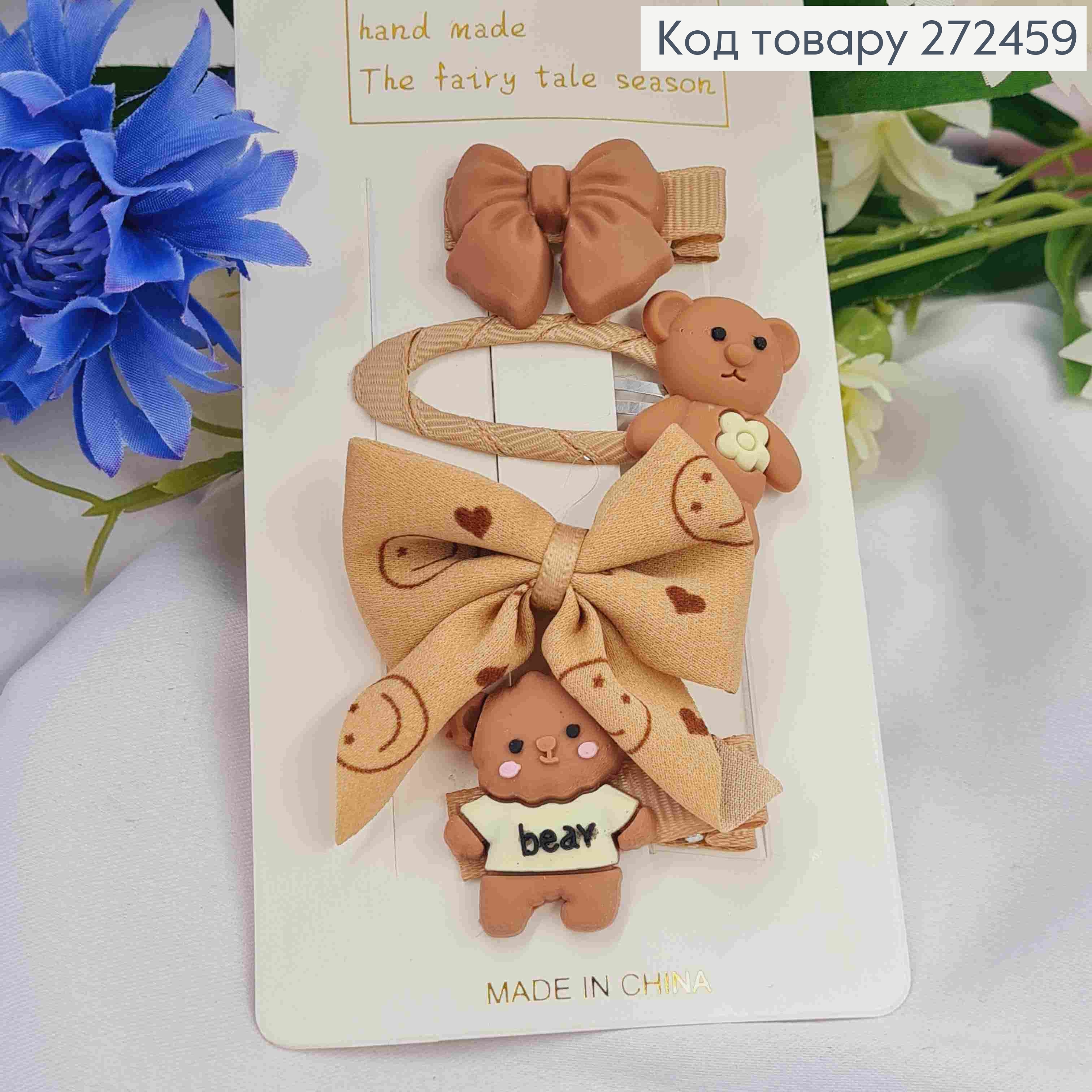 Набір дитячих заколок (4шт) ВЕДМЕДИК+БАНТ, розмір 3*2,5см, заколка стріла 3см, ПАСТЕЛЬНИХ кольорів