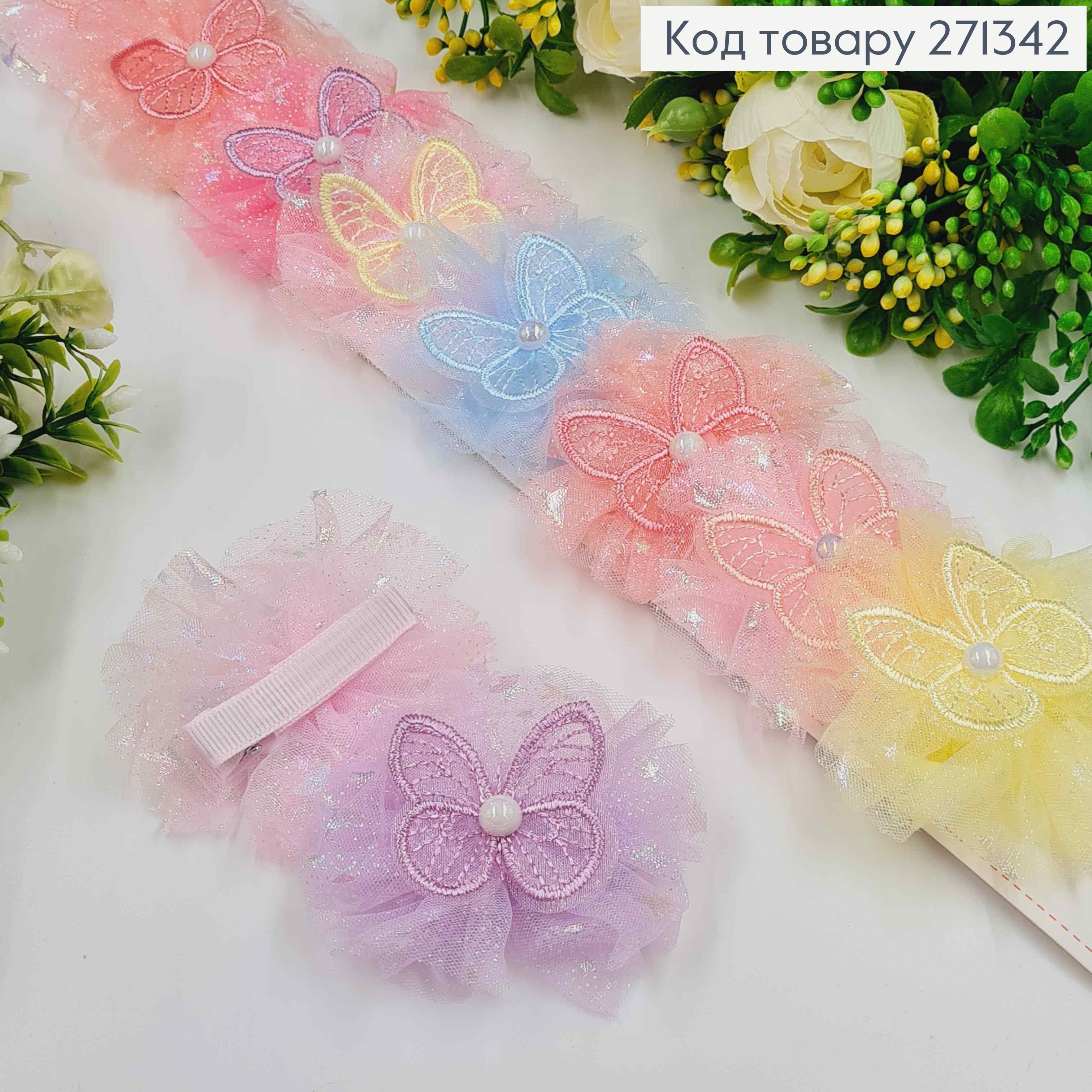 Набір дитячих заколок, клювик, з блискучим фатином та Метеликом з перлинкою, 10 шт/наб.