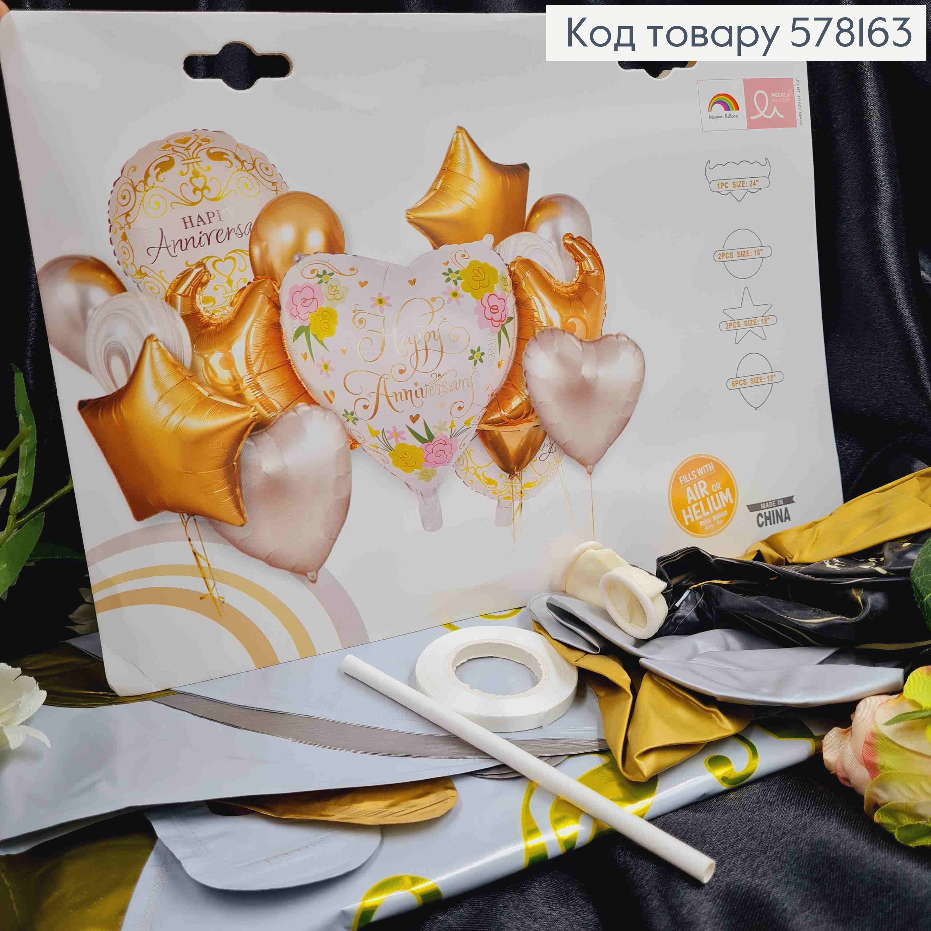 Набір фольгованих куль "Happy Anniversary", Серце 1шт, Круглі 2шт, Зірки 2шт, Латексні 6шт