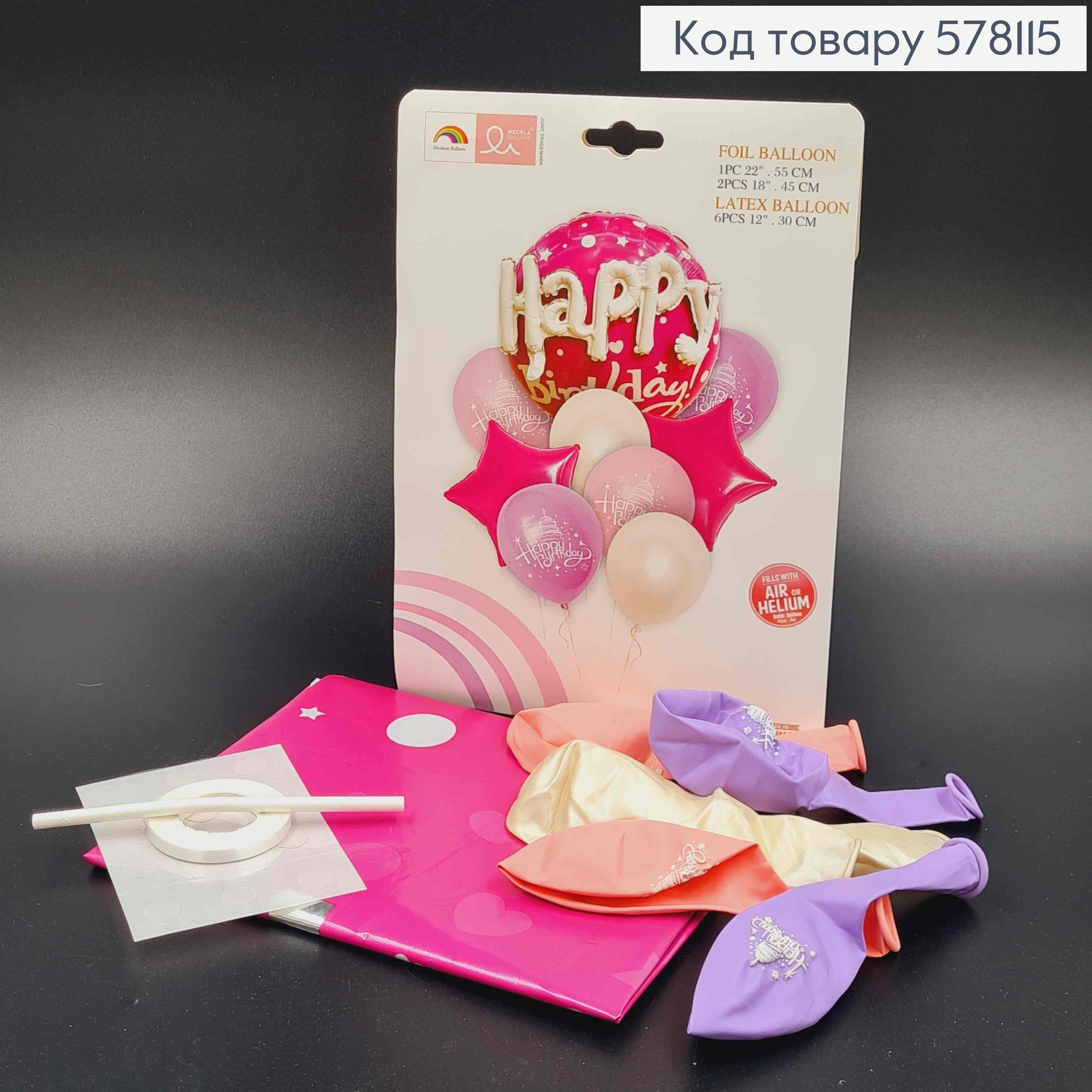 Набір фольгованих куль рожевих "Happy Birthday", 1шт( 22'')+2шт(18'')+6шт(латексні12'')