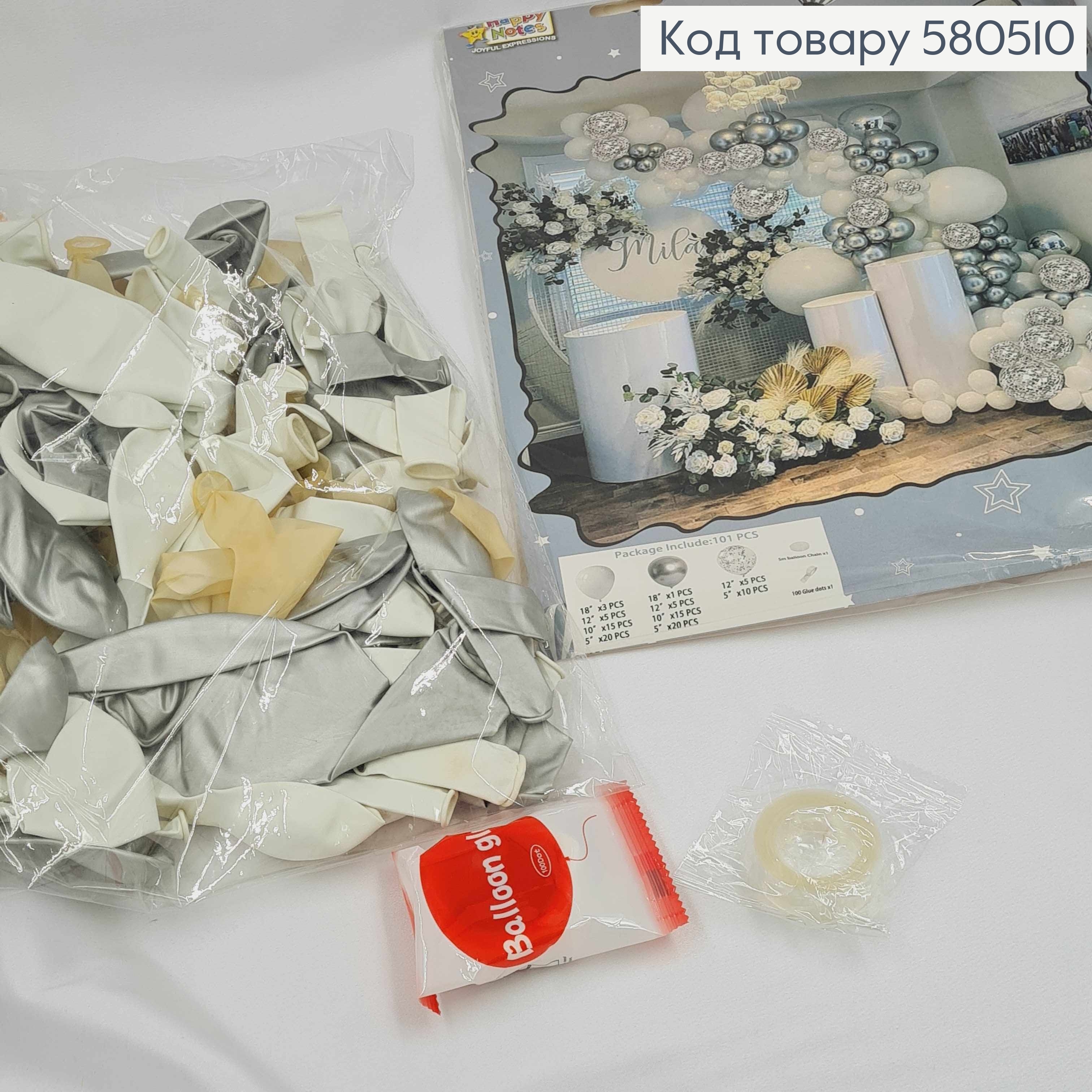 Набір повітряних куль "Фотозона"СРІБНО-БІЛІ",101шт(18"12",10",5")+2стрічки