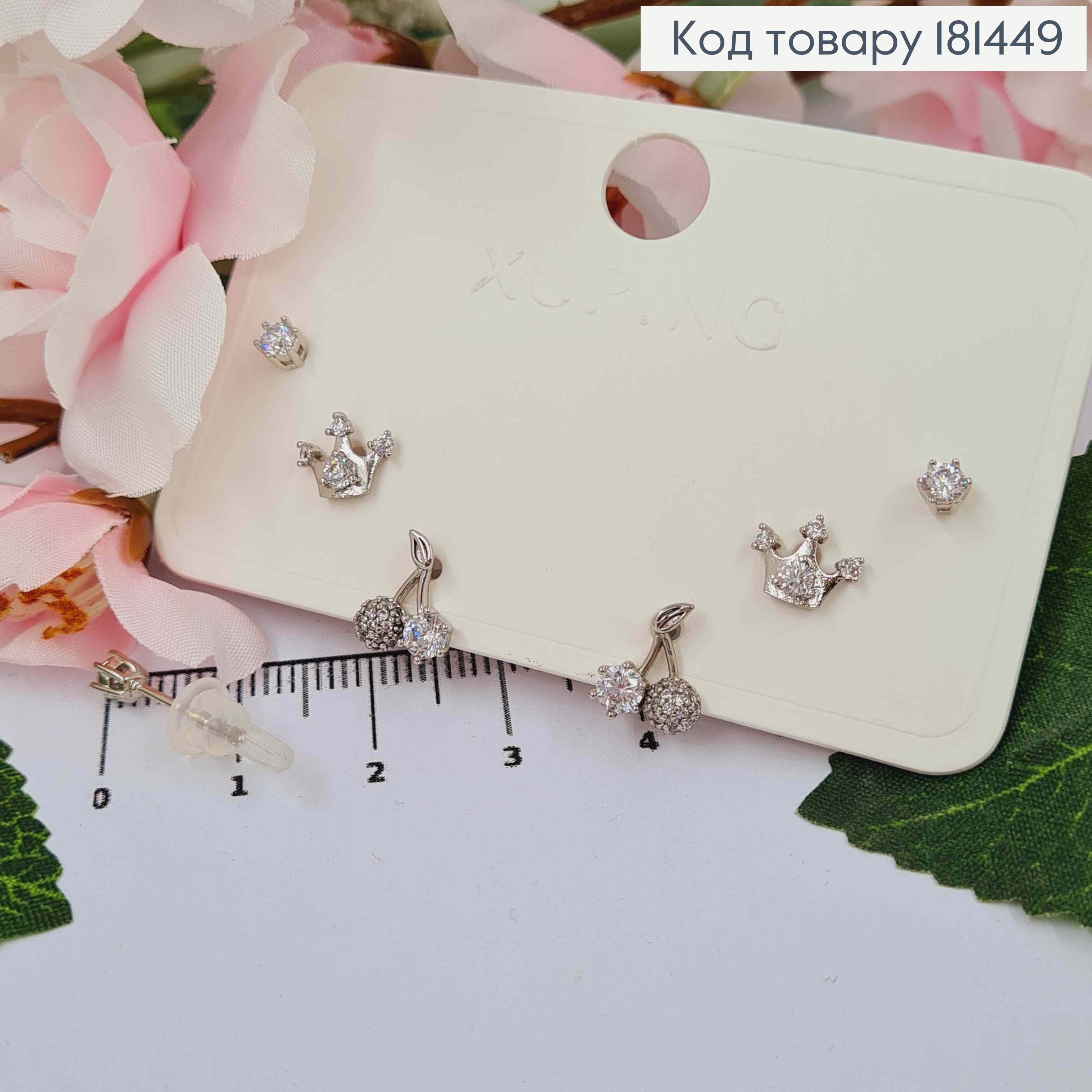 Набір сережок родованих (3п), Вишні і Корона в камінцях, та просто з камінчиком, Xuping