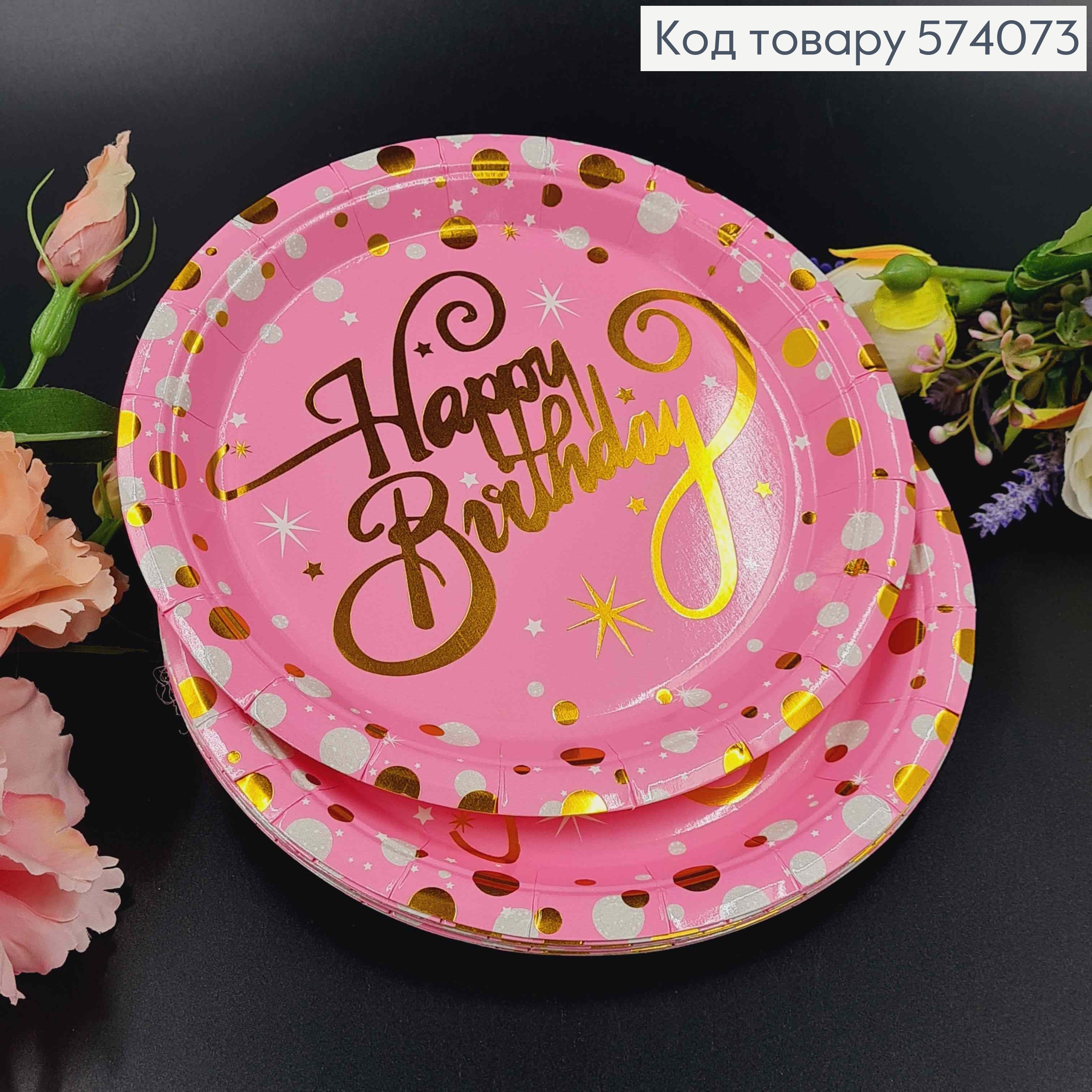 Набір тарілок паперових, з написом "Happy Birthday" Рожевим-Золотом на Білому фоні, 10шт/уп, 18см 574140 фото
