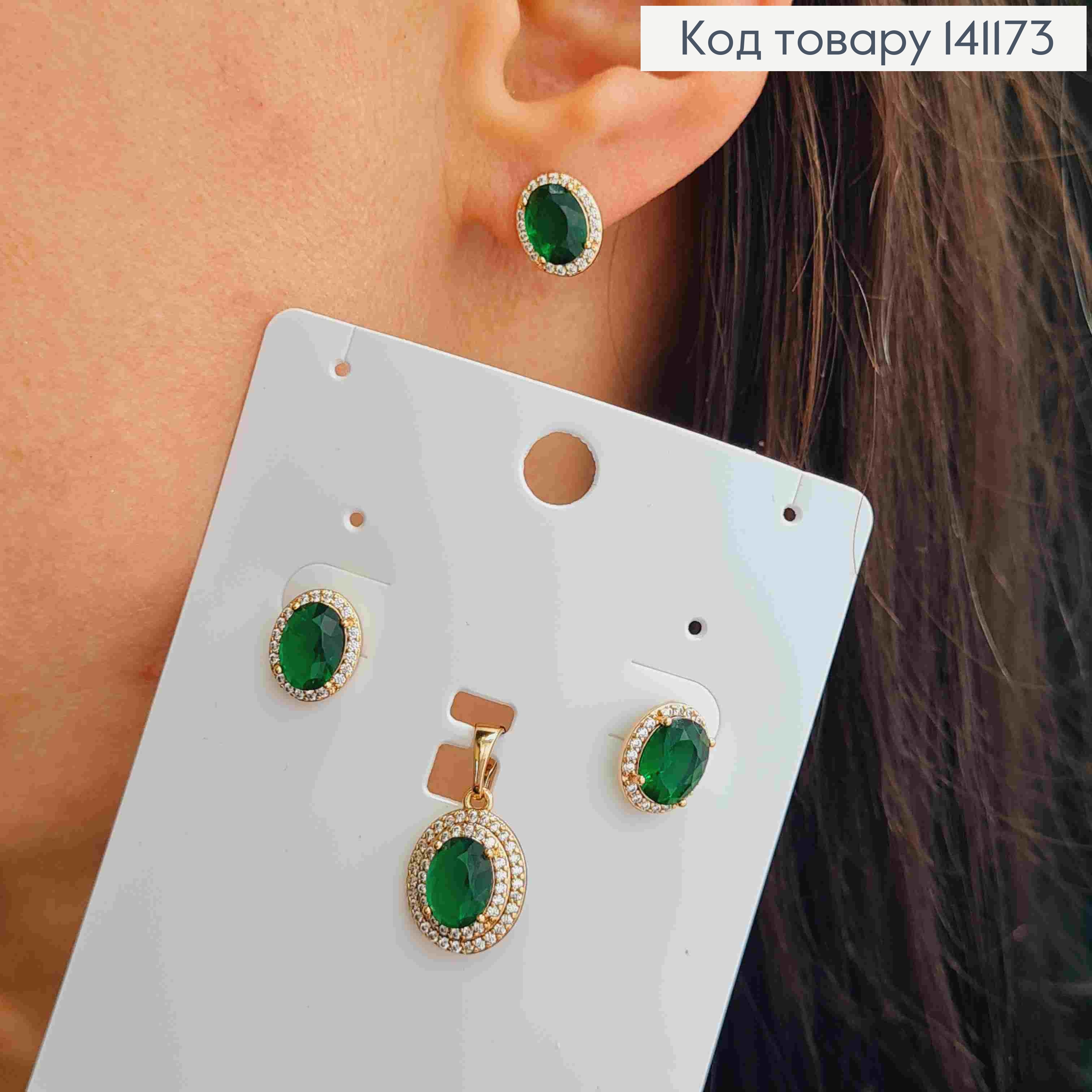 Набір: з Зеленим каменем та Блискучими камінцями, Сережки гвіздки(1см), Кулон(1,5см), Xuping 18К