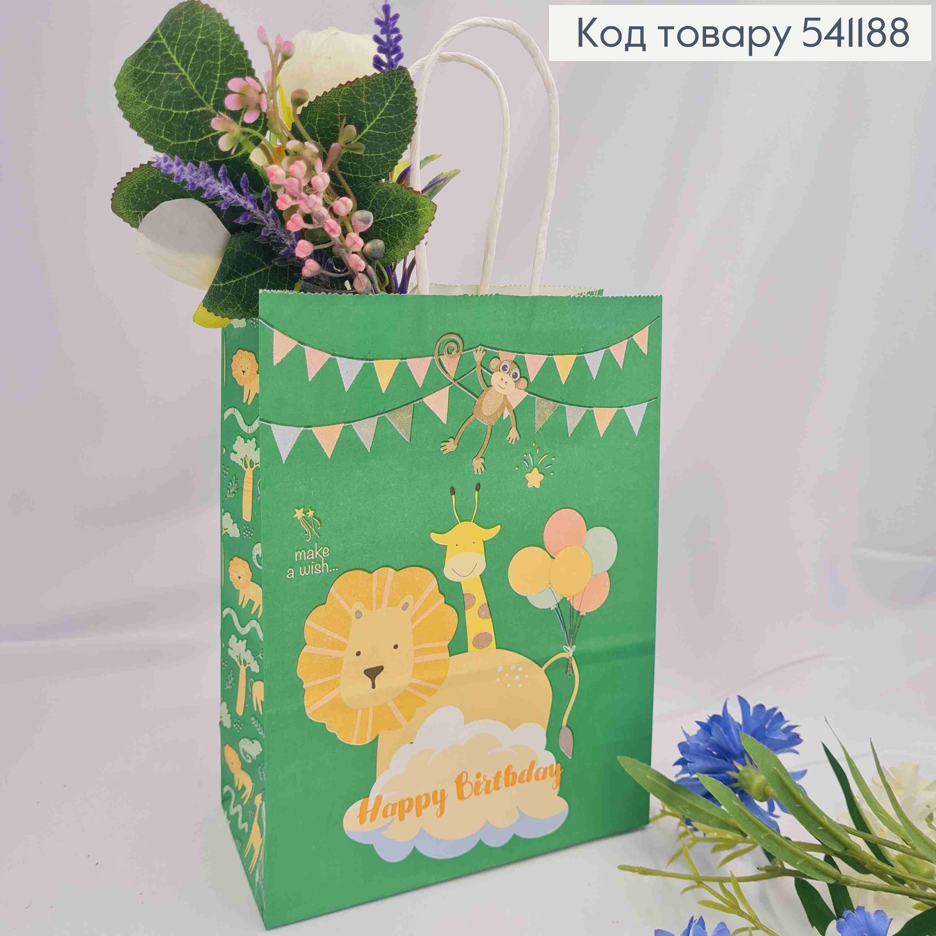 Пакет крафтовий, 16*22*8см, Зелений з Тваринами та написом "Happy birthday"