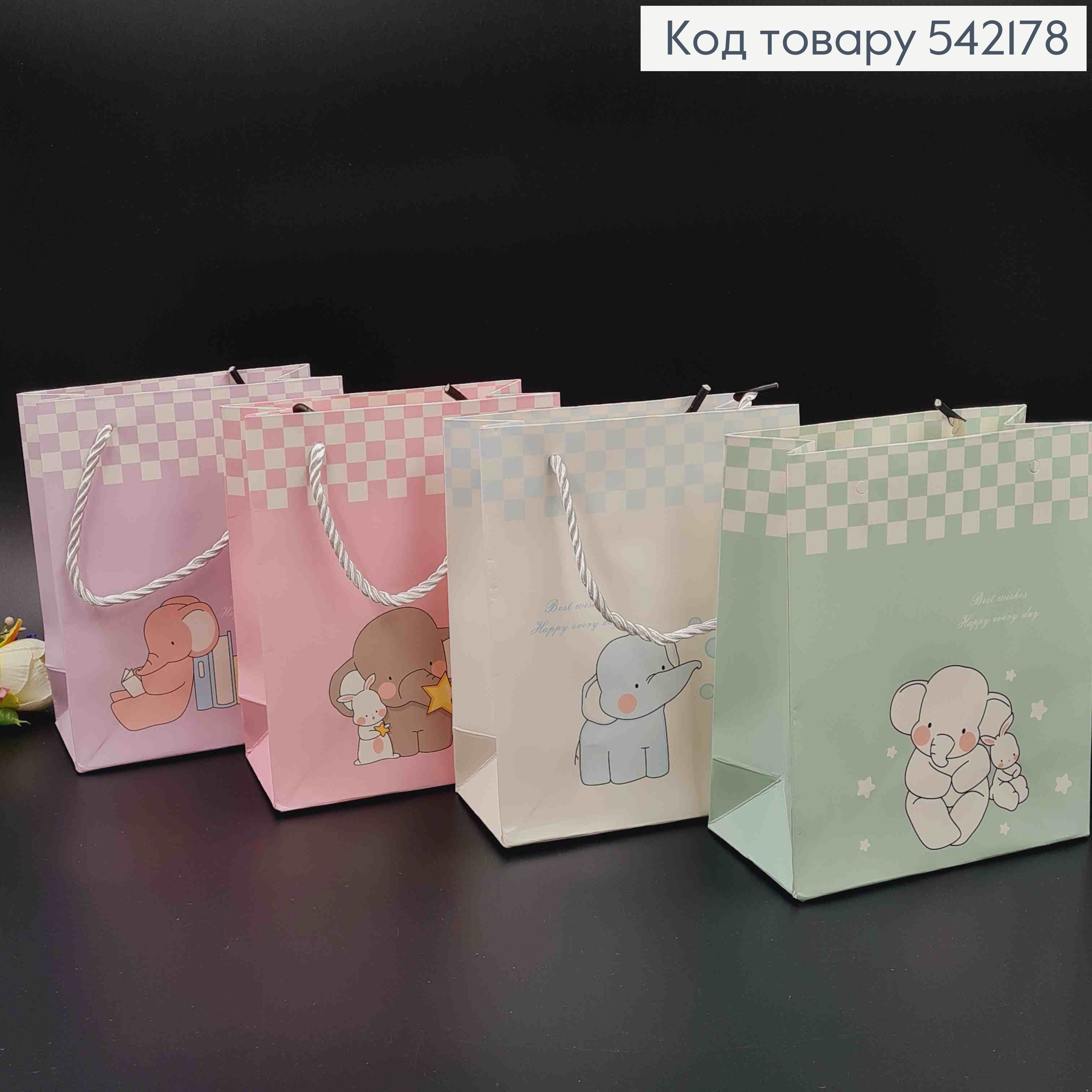 Пакет паперовий, в пастельних тонах з тваринками, з шахматним принтом, в асорт. 17*14см