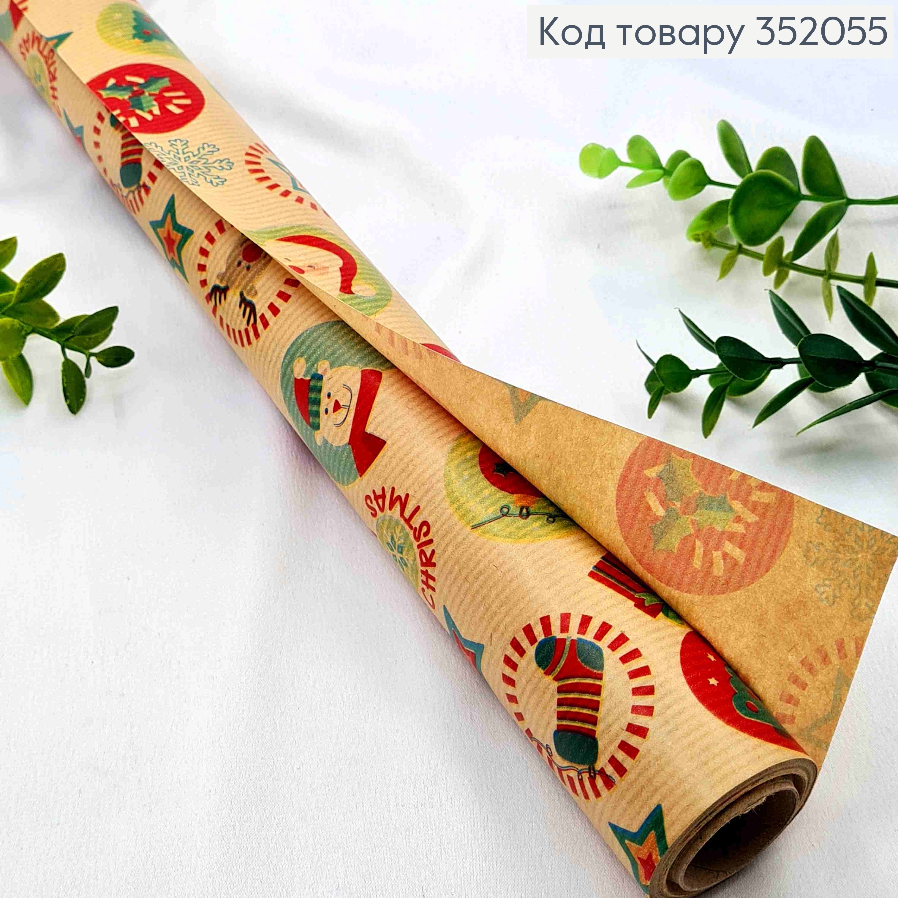 Папір крафтовий новорічний "Новорічні атрибути в кружечку", рулон 70см, довжина 7метрів, №3014