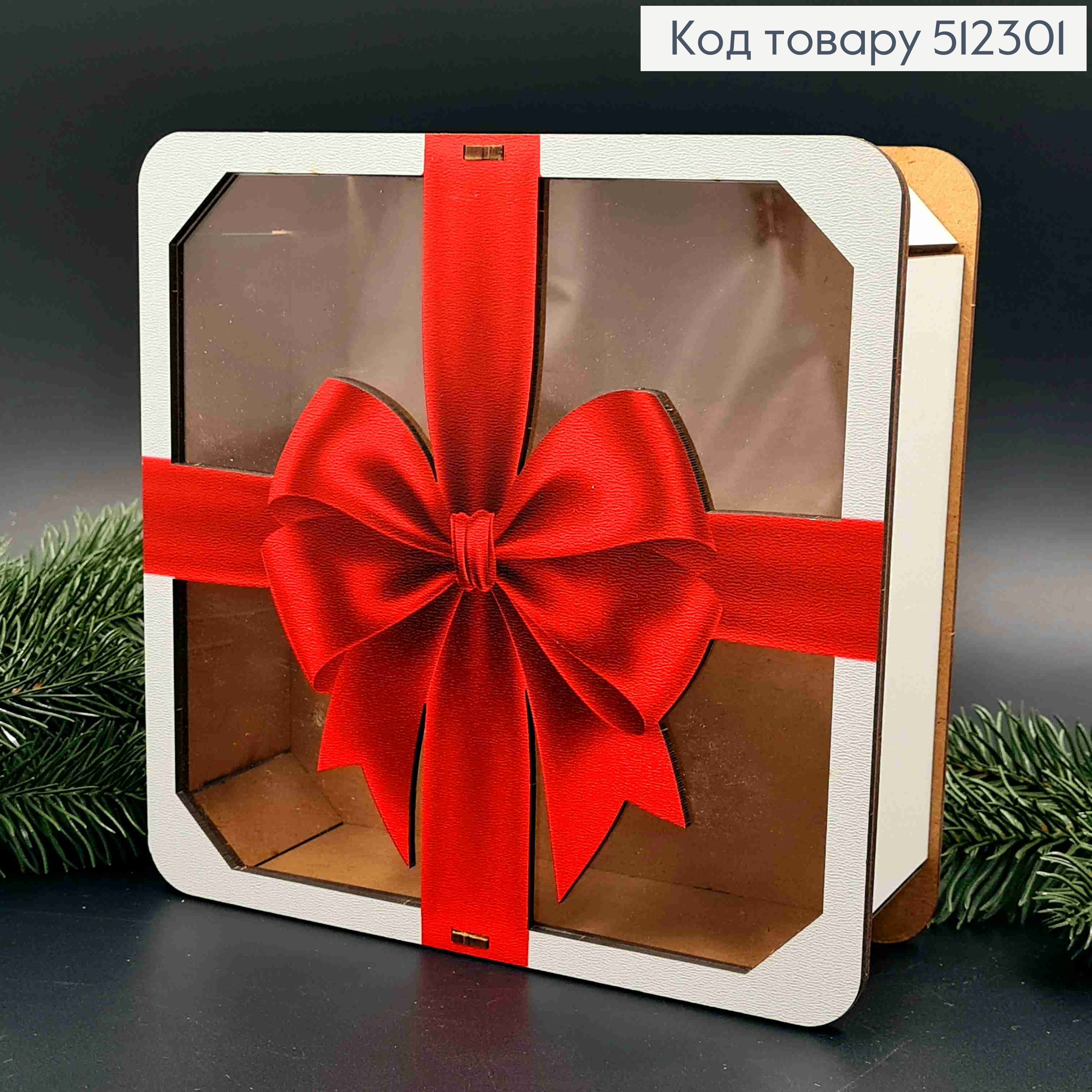 Подарункова дерев'яна коробка з принтом "Червоний Бант", Квадратна 20*20см, висота 6см 512301 фото