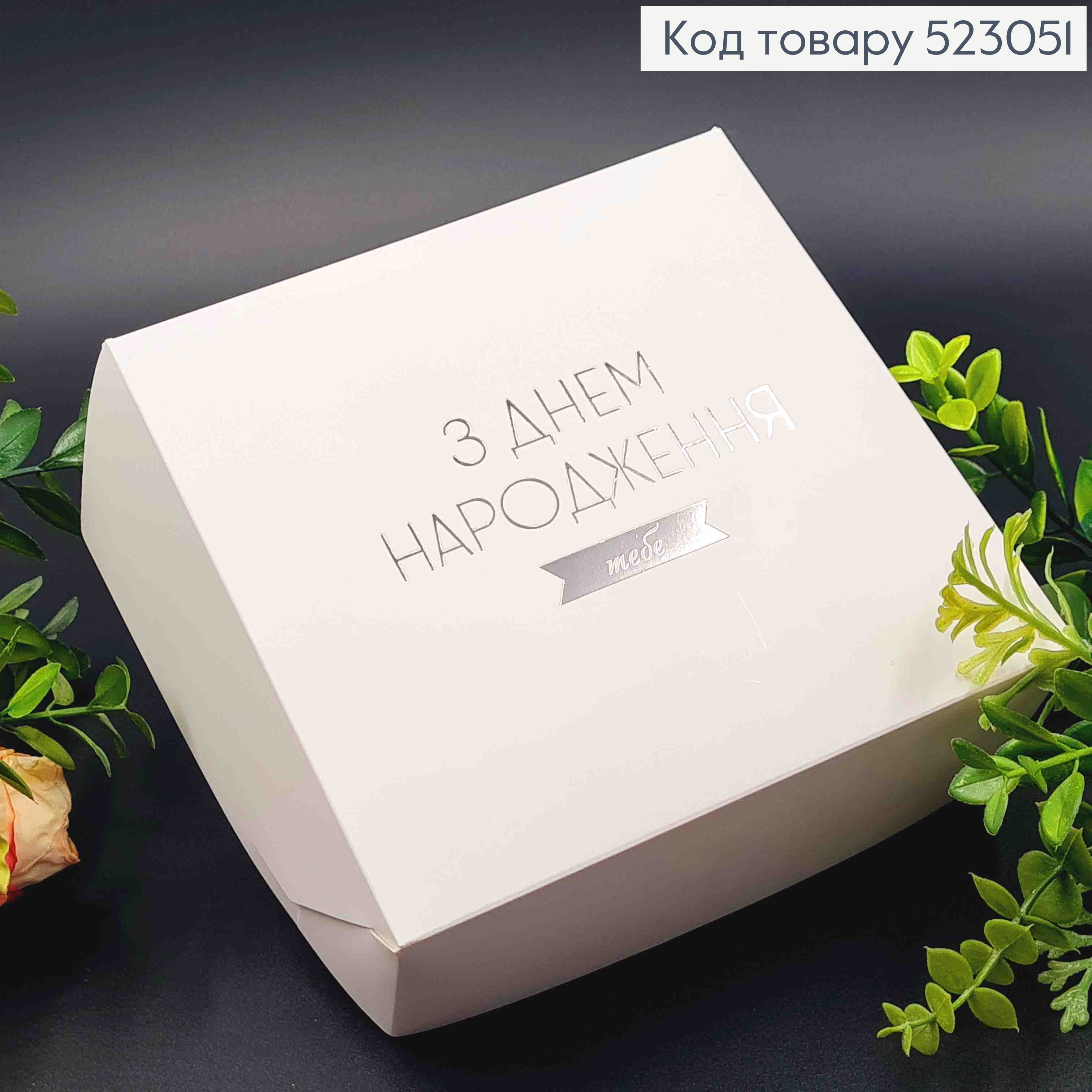 Подарункова складна коробка, Білого кольору з Срібним тисненням "З Днем Народження ТЕБЕ!", 15*15*6см