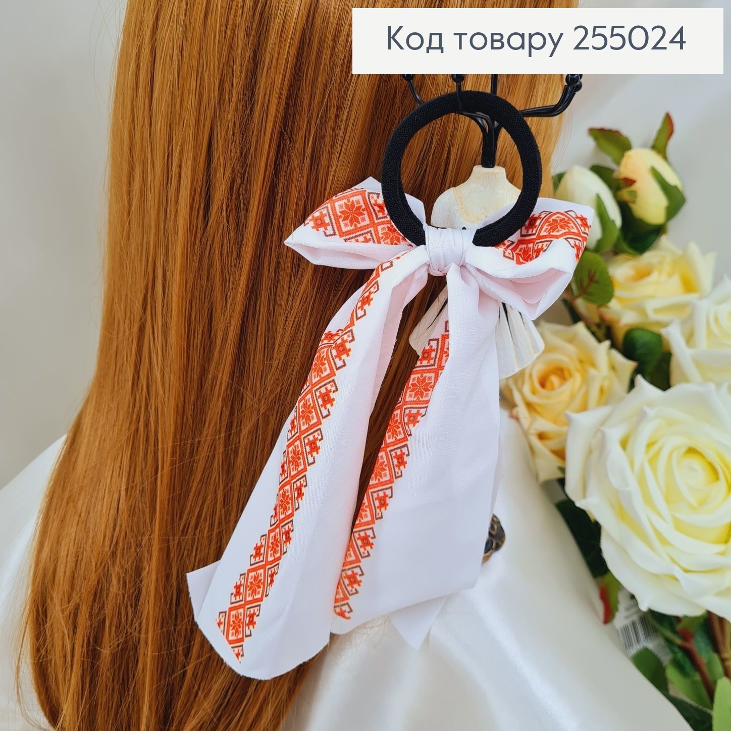 Бант БІЛИЙ з Червоно-Чорним орнаментом, на резинці, тканина репс, розмір 10*6см, ручна робота 276104 фото