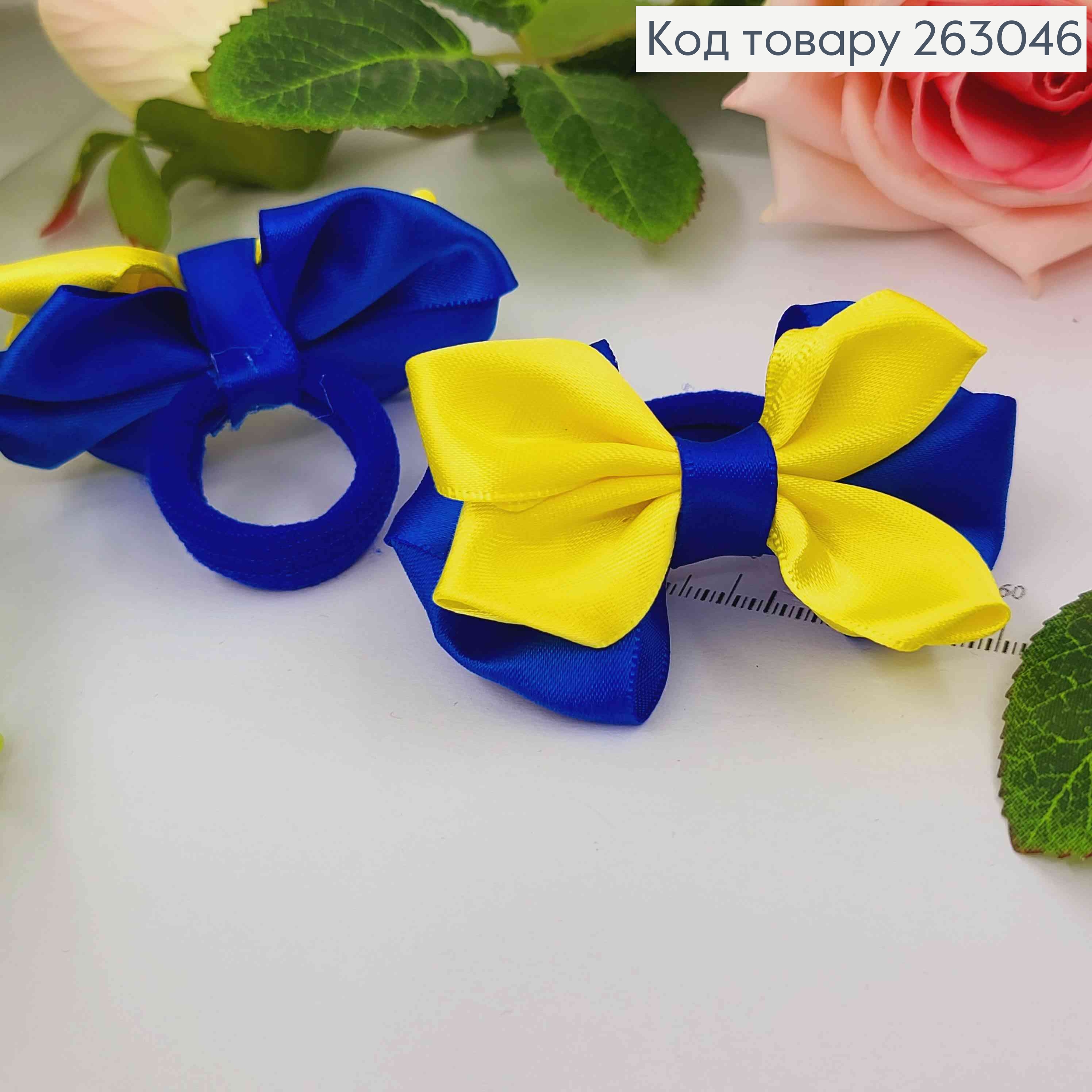 Резинка, БАНТ репсовий, Жовто-Синього кольору з додатком у вигляді квітки, 10*8см, Ручна робота 276008 фото