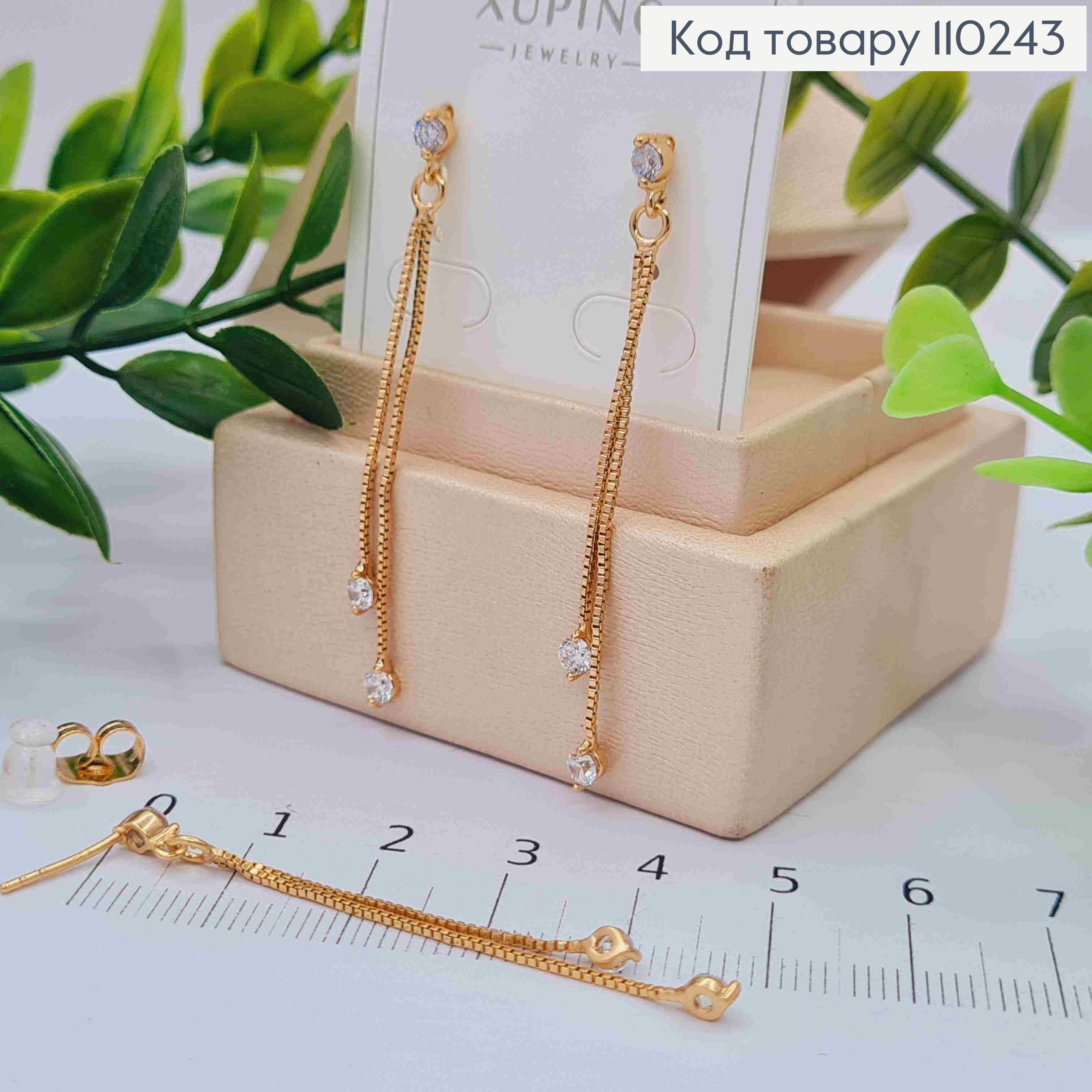 Сережки гвіздки з підвісними камінцями на ланцюжках, довжина 5см, Xuping 18K