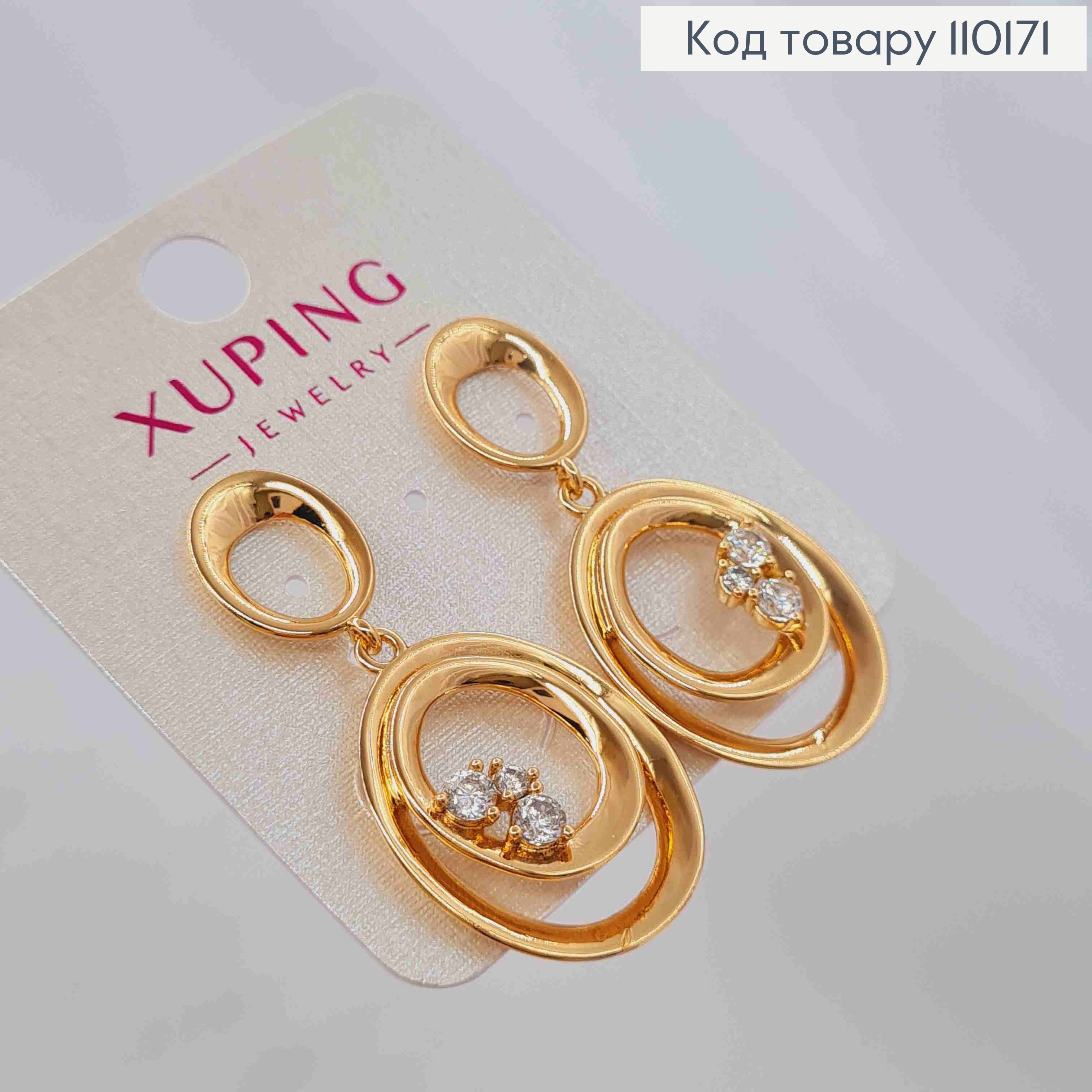 Сережки кільця з трьома Блискучими камінцями, діаметр 2,5см, застібка шпилька, Xuping 18К 110170 фото