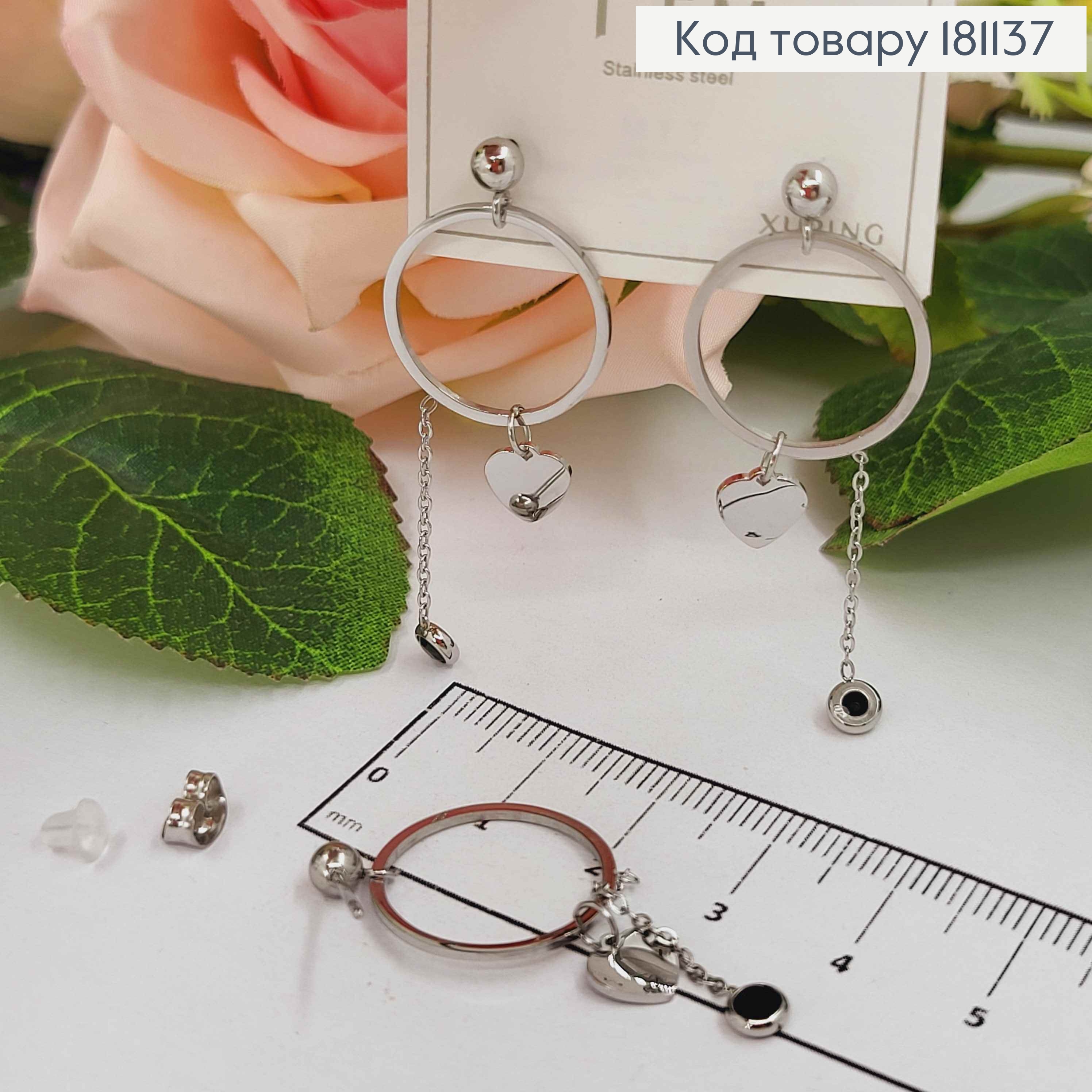 Сережки гвоздики родовані, підвіски кола з ланцюжками та сердечком, з чорним камінцем, Xuping