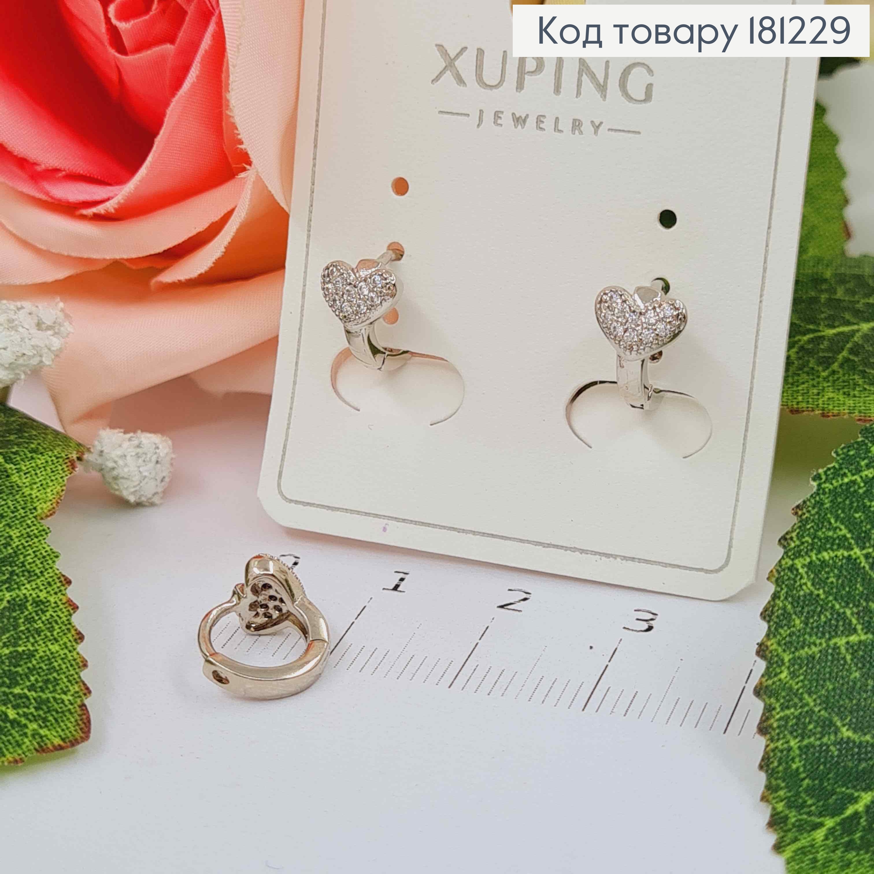 Сережки кільця родовані, 1см, з об'ємним сердечком в камінцях, Xuping