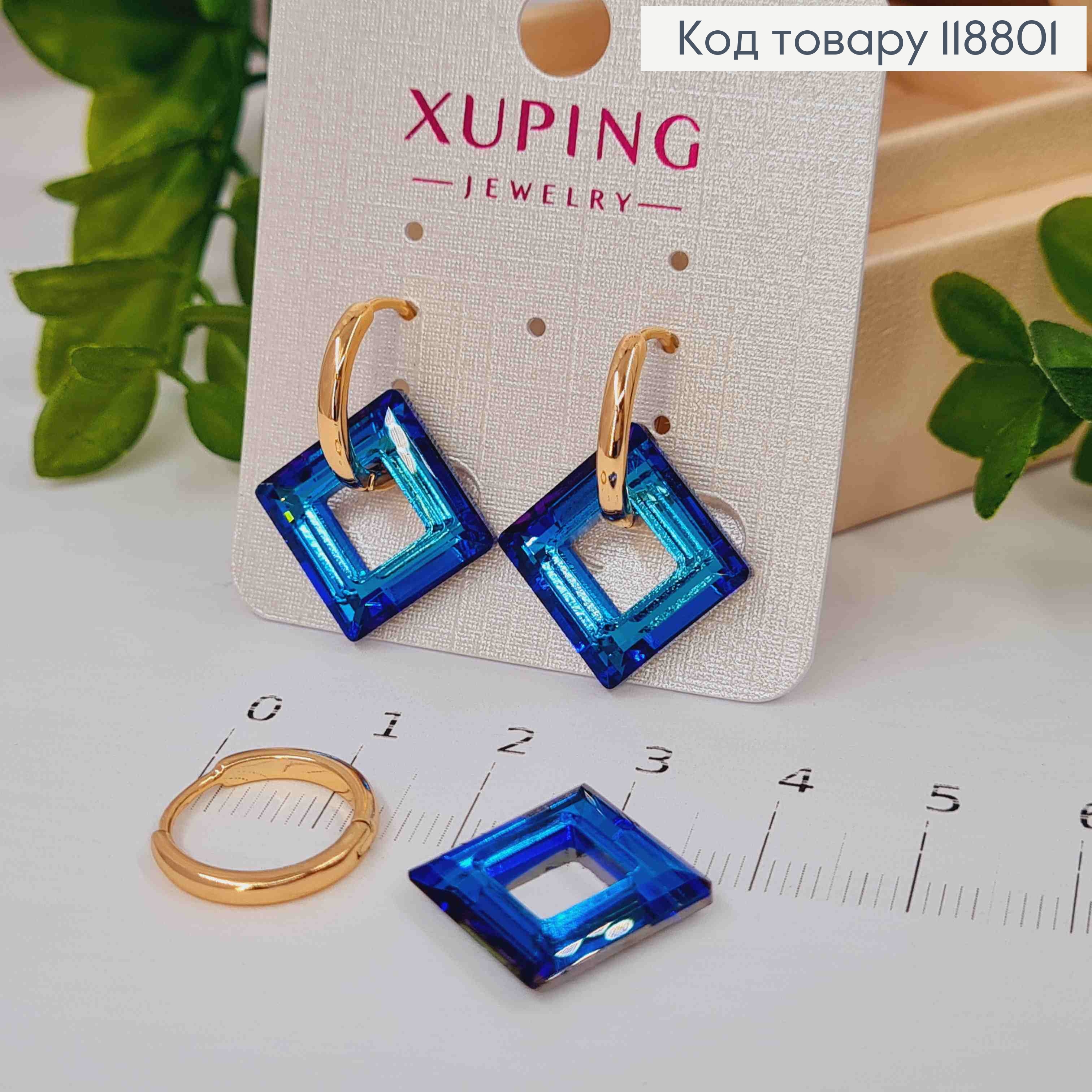 Сережки з квадратним Блакитним каменем Сваровскі, довж. 1,5см, застібка левербек, Xuping 18К 119740 фото