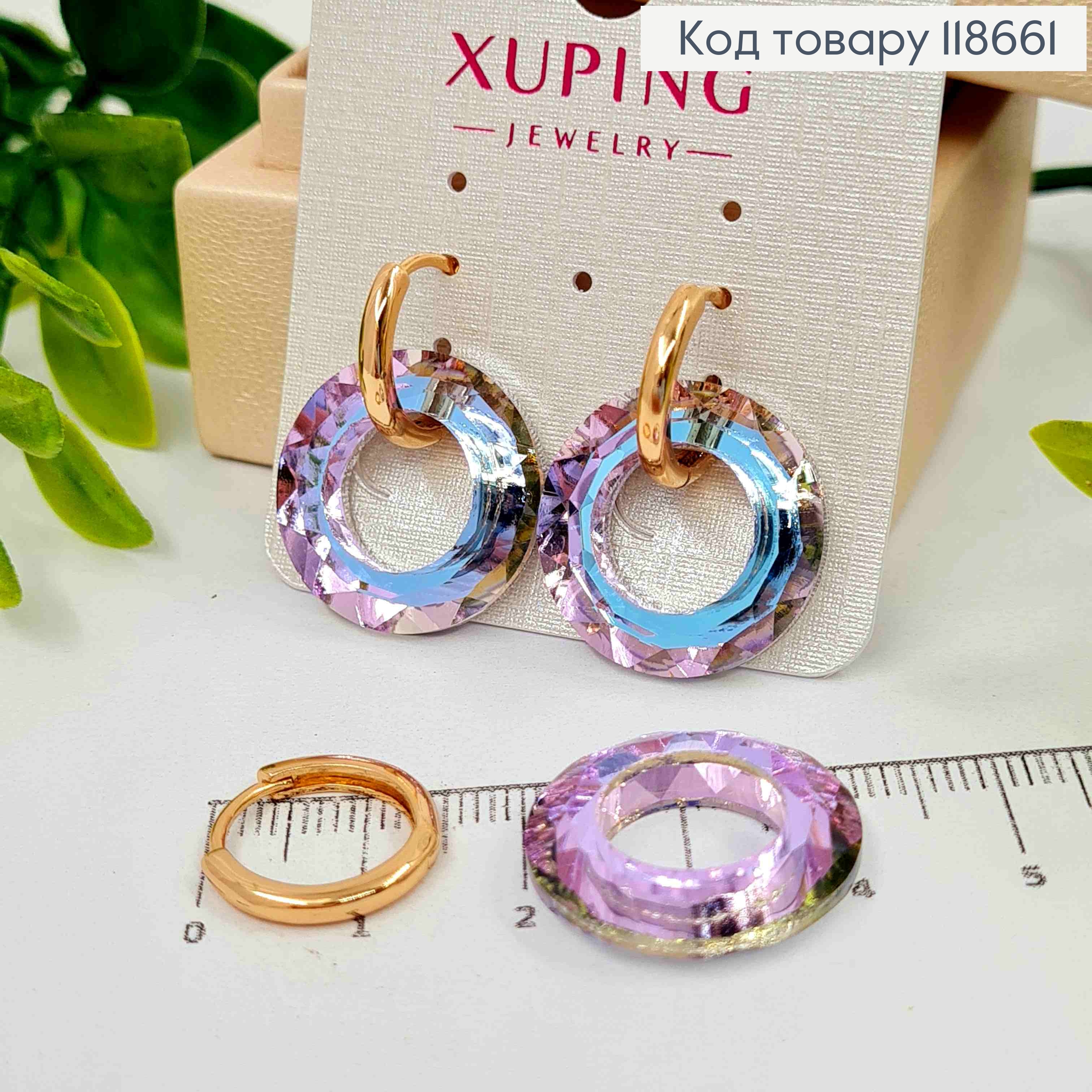 Сережки кільця з підвісним Фіолетово-Блакитним каменем Сваровські , діаметр 1,5+2см, Xuping 18К