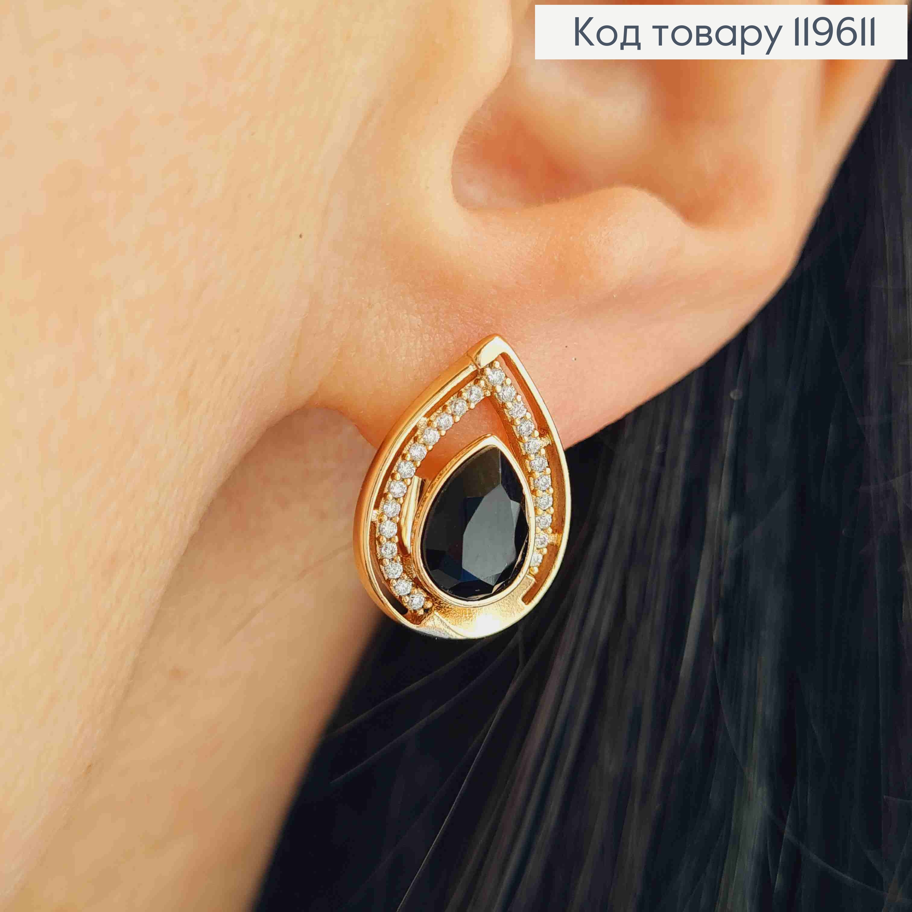 Сережки "Краплинка" з Чорним каменем Сваровські, довж. 1,6см, англійська застібка, Xuping 18К