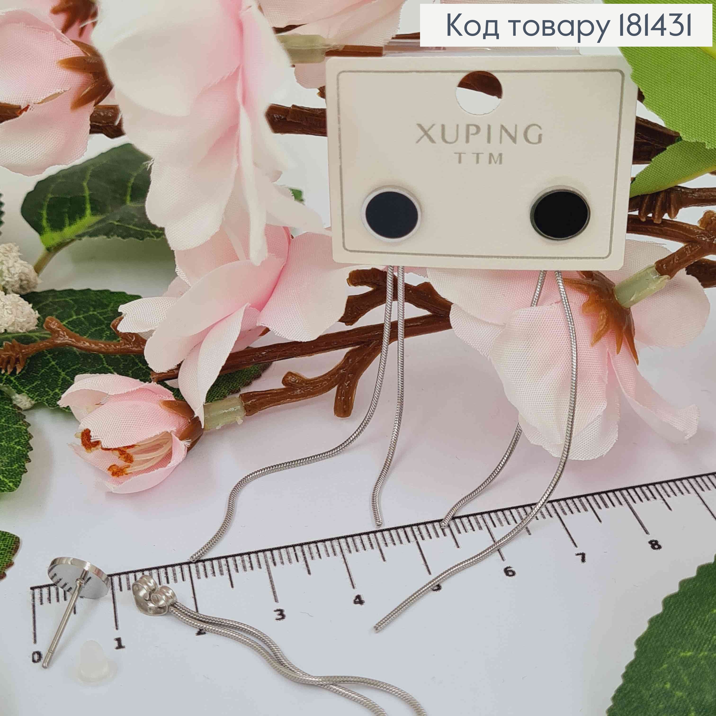 Сережки родовані, гвіздки, Чорна кнопка діаметр 8мм з підвіскою два ланцюжки довжиною 7см,Xuping