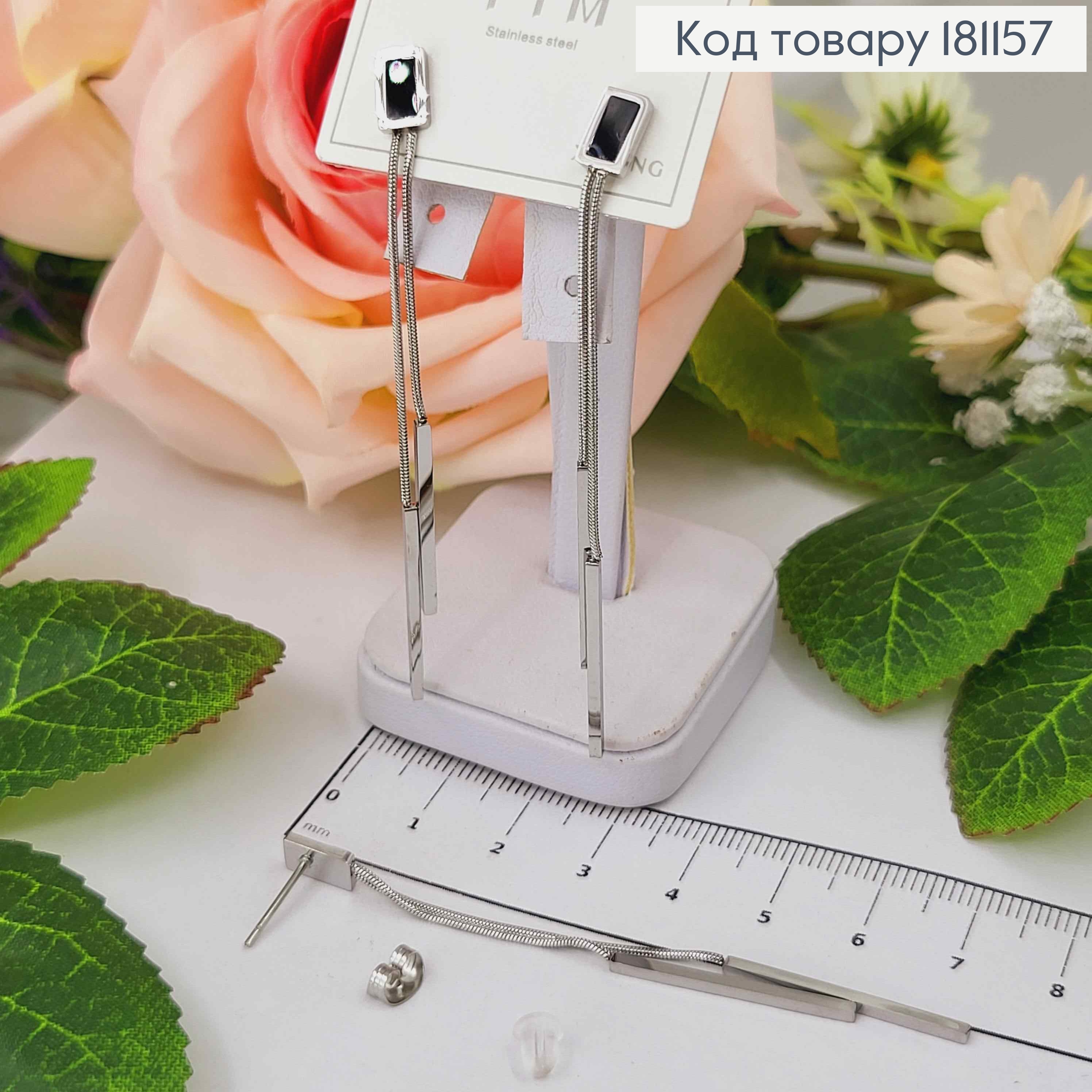 Сережки родовані, гвоздики прямокутнички з чорною емалькою, двома ниточками з палочками 7см, Xuping