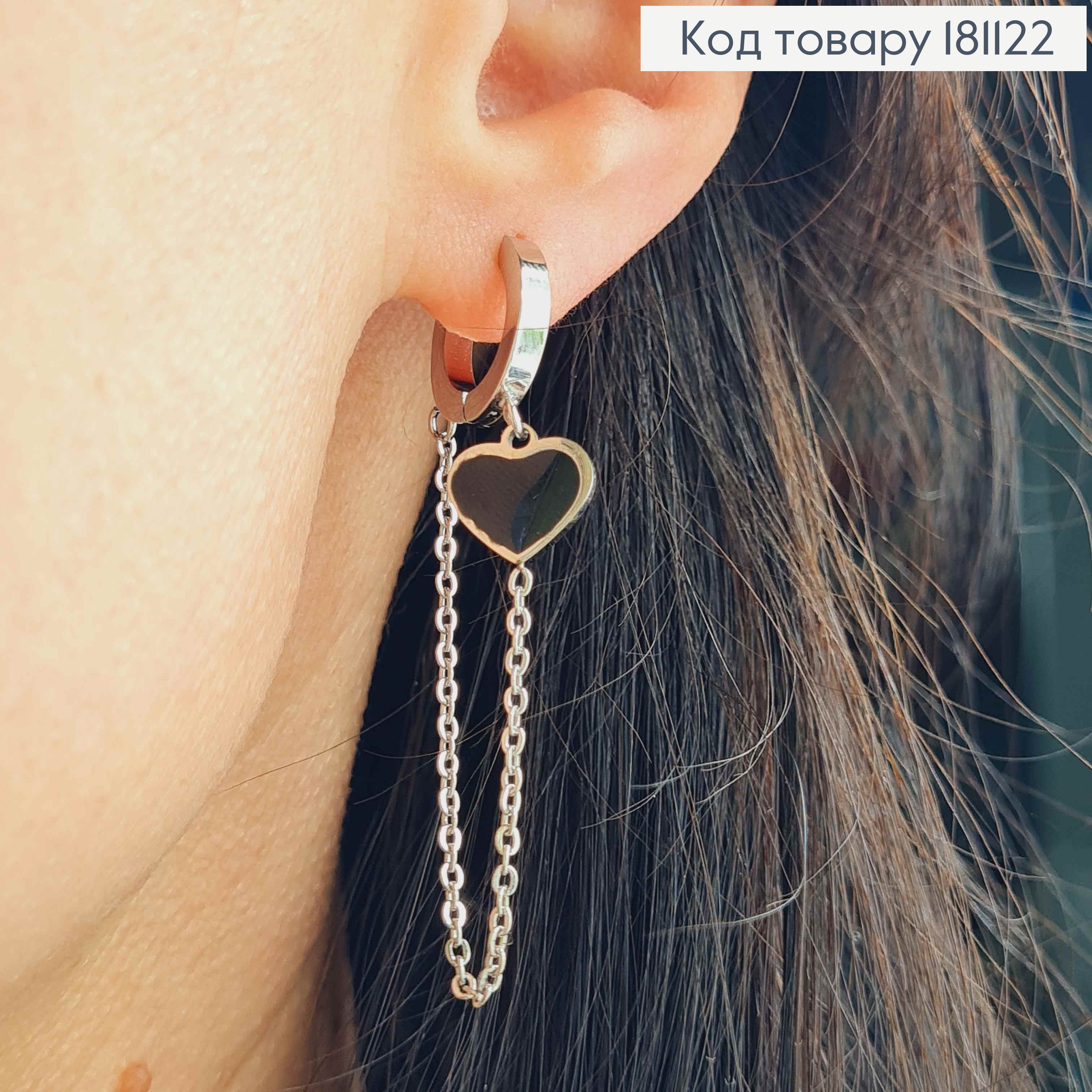 Сережки родовані кільця 1,3см, з підвісками ланцюжками та Сердечкам, з чорною емаллю, Xuping