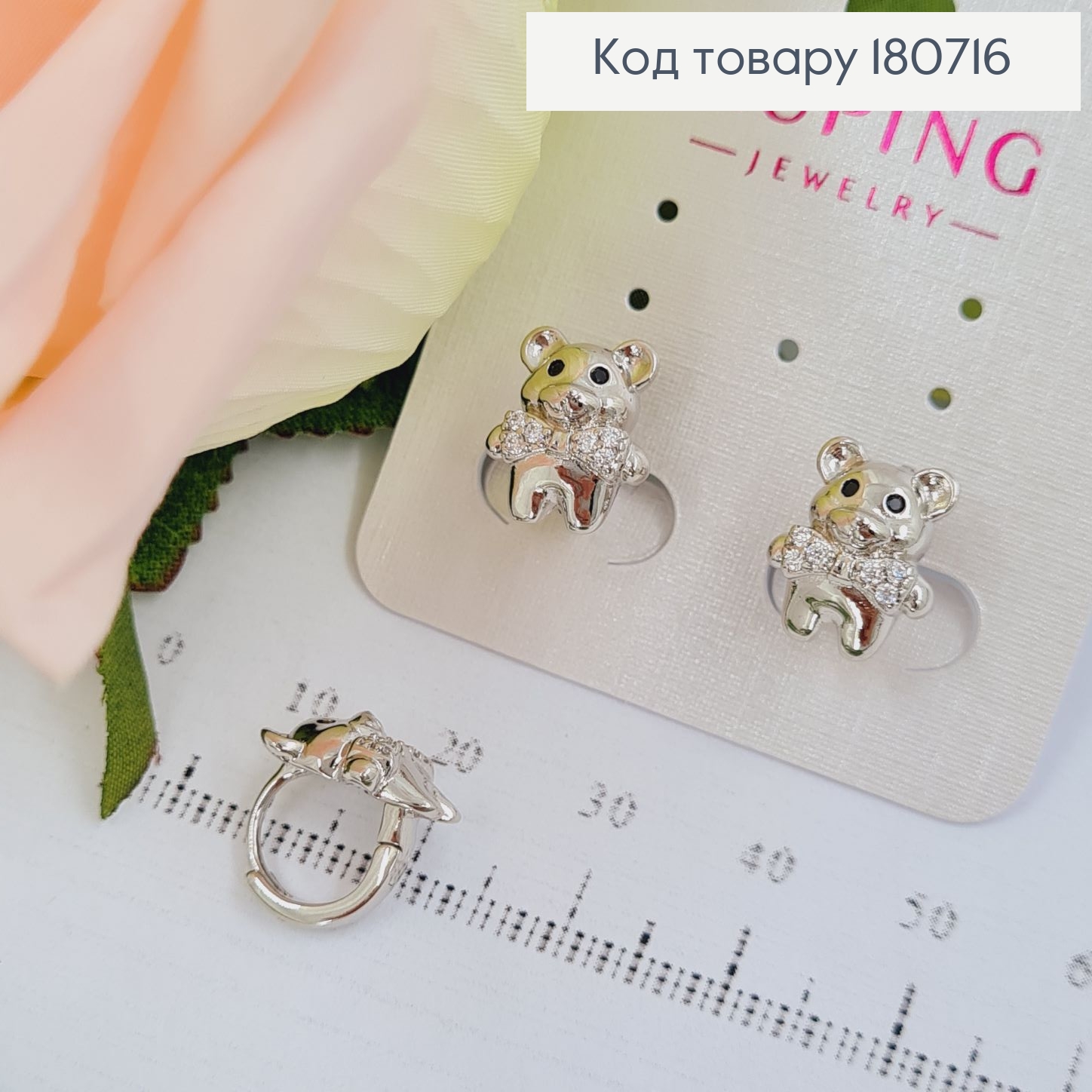Сережки родовані кільця Ведмежа з бантиком в камінцях, 1,3*1см, Xuping