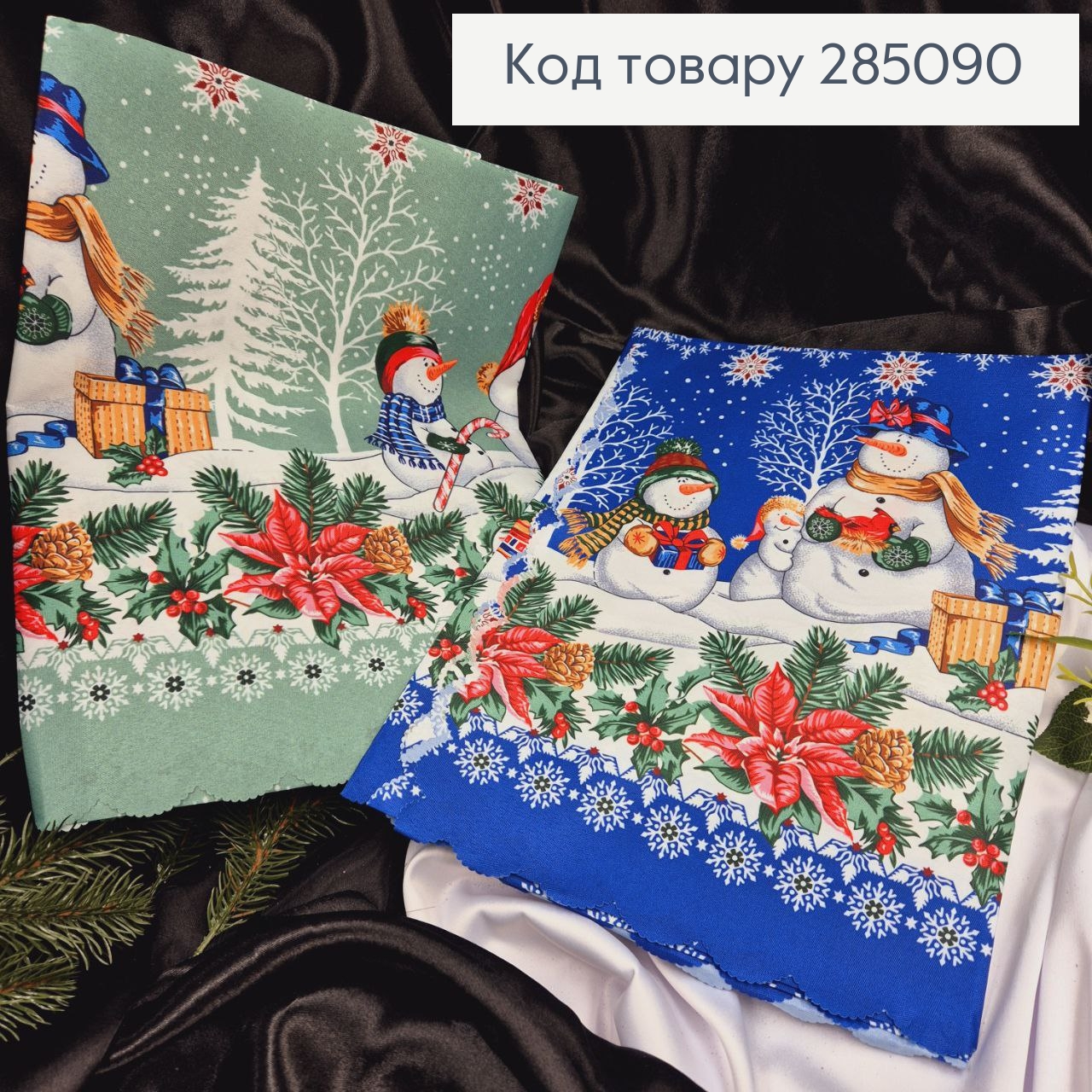 Скатертина новорічна синяя и зелена в асорт "Сніговички з подарунками", розмір 110*150см