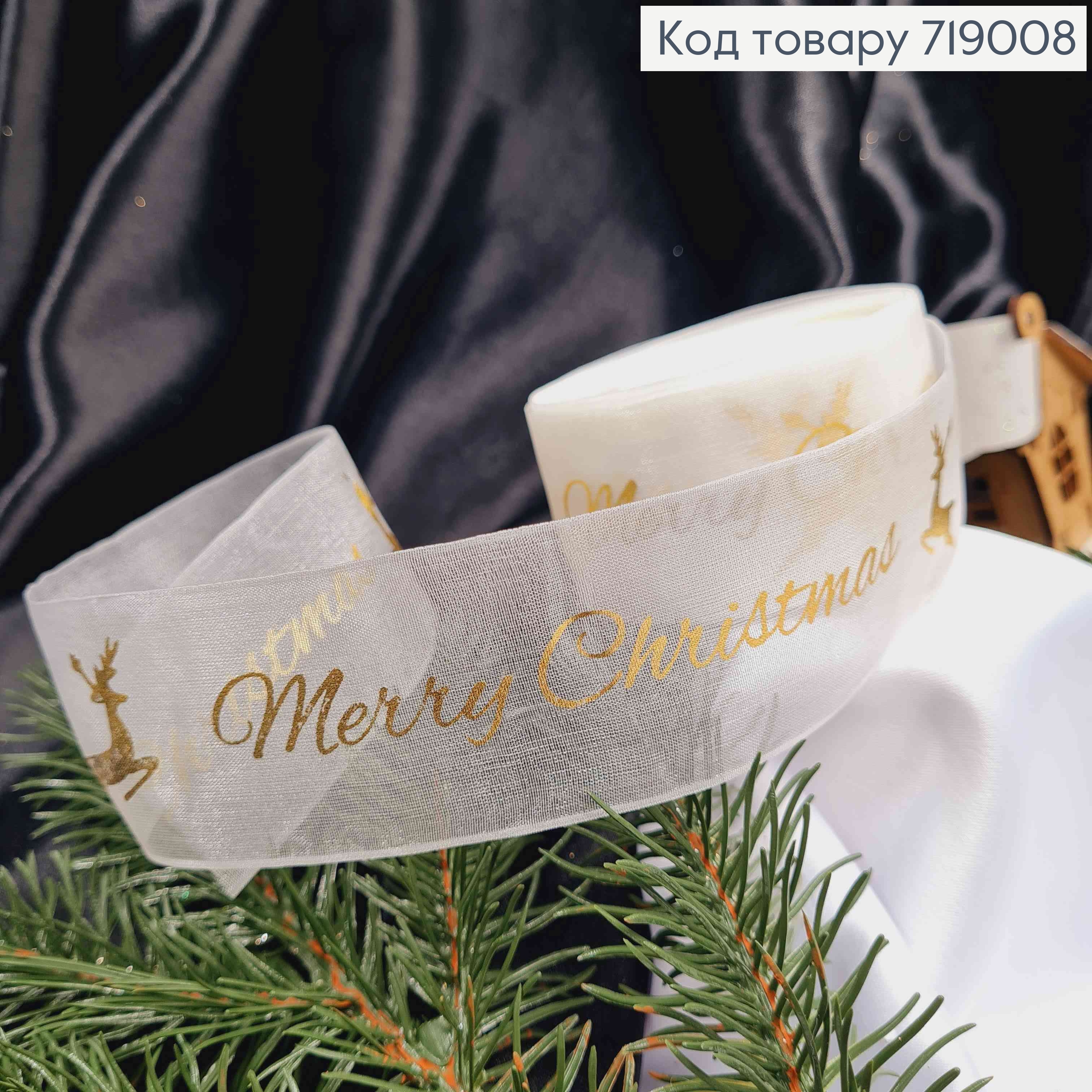 Стрічка органза БІЛА з принтом "Merry Christmas" золотого кольору, шир. 4см, довж. 25 ярдів (23м)