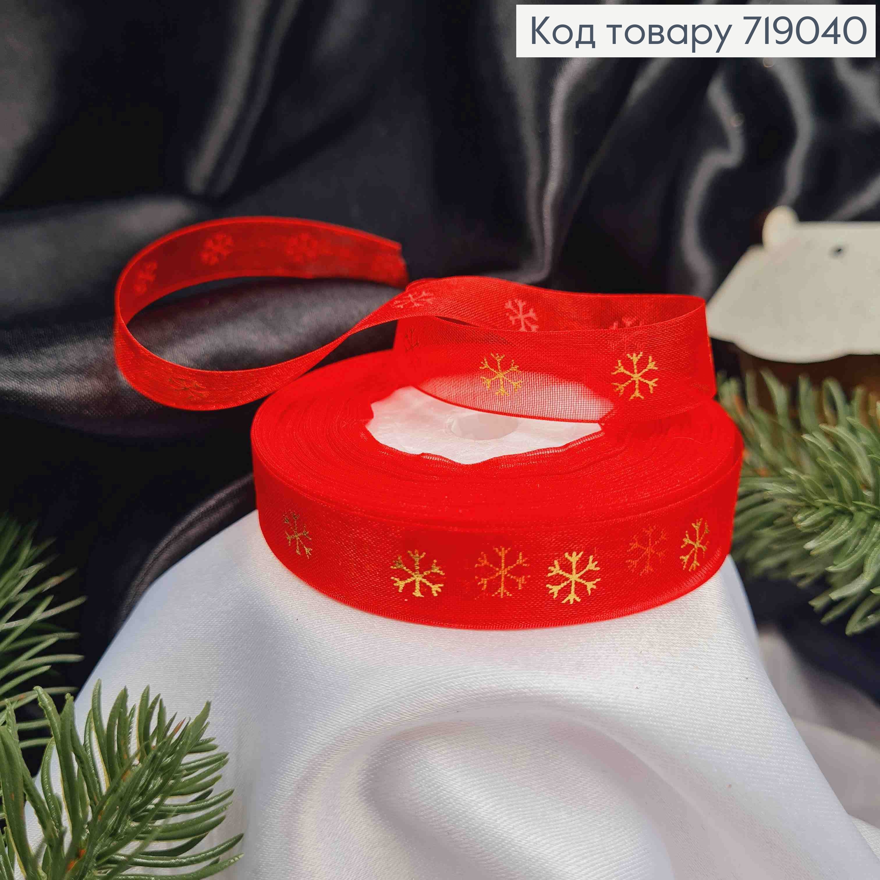 Стрічка органза ЧЕРВОНА з принтом "Сніжинки" золотого кольору, ширина 1,3см, довжина 25 ярдів (23м)