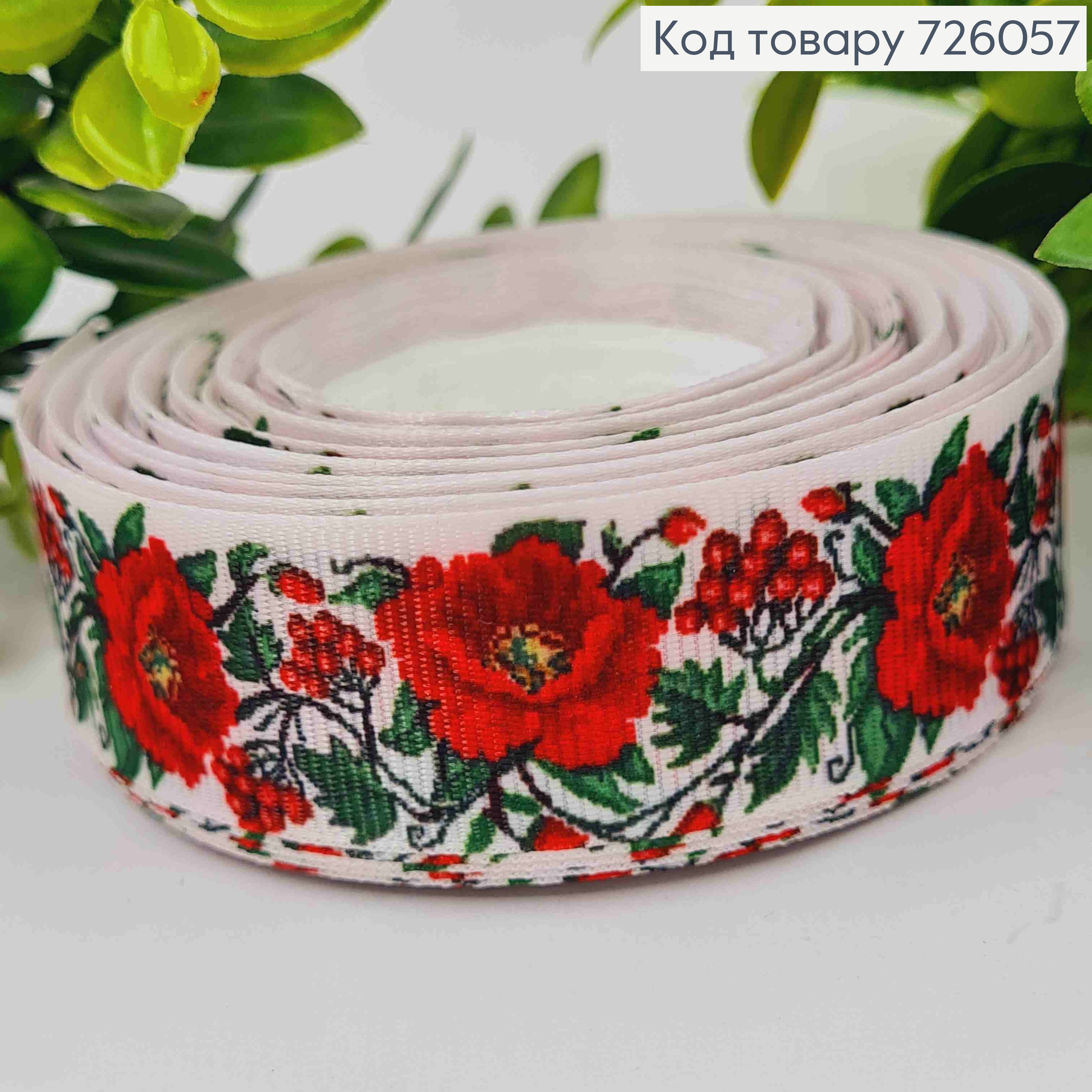 Стрічка репсова, БІЛА з принтом "Червона Квітка", ширина 2,5см, довжина 25 ярдів (23м)