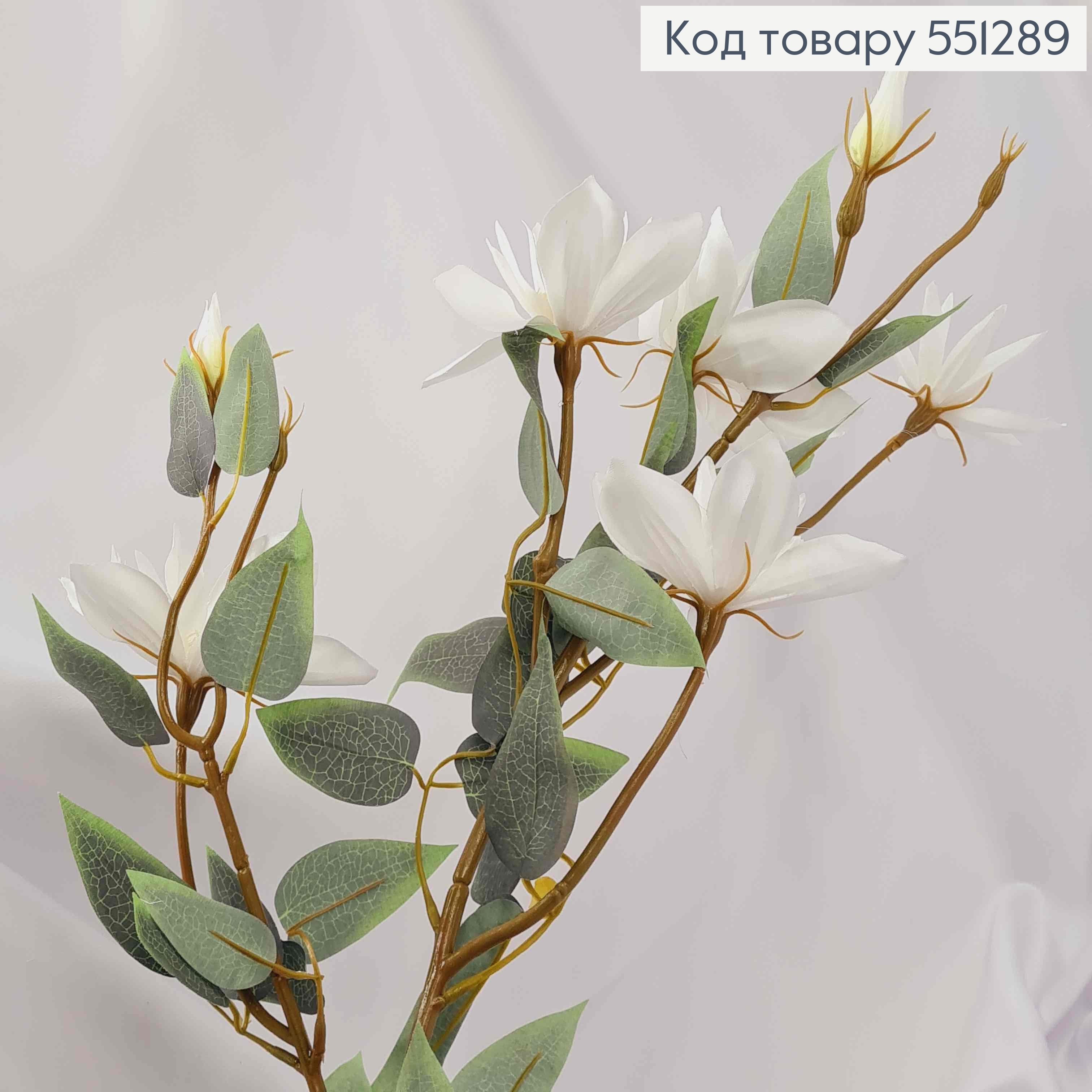 Штучна квітка Клематіса, БІЛА з пастельними листочками (5 квіток+2 бутони), композиція висотою 85см