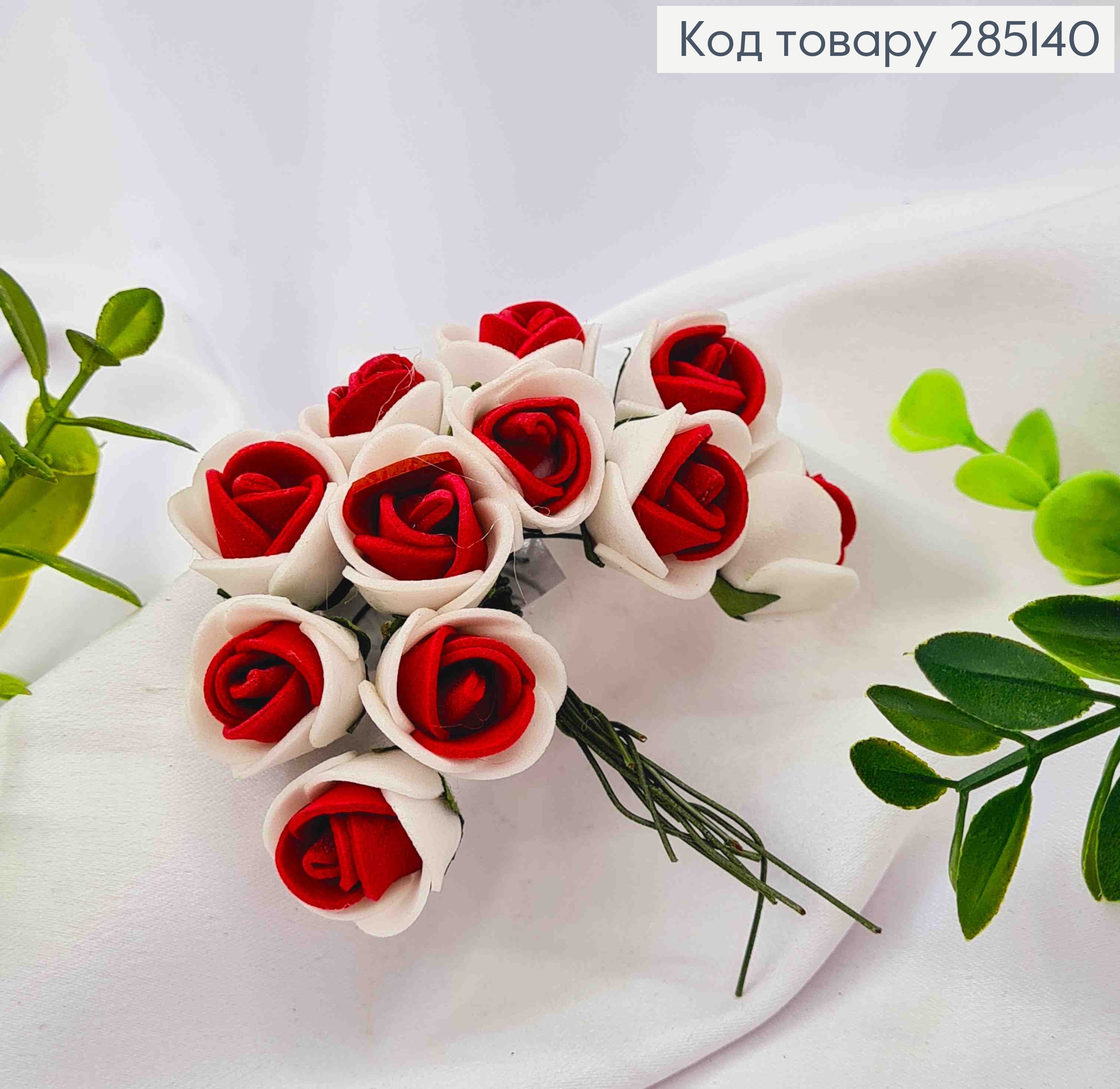 Штучний додаток Троянда фомова (12шт/пучок), БІЛО-ЧЕРВОНОГО кольору, на дротиках, 8см