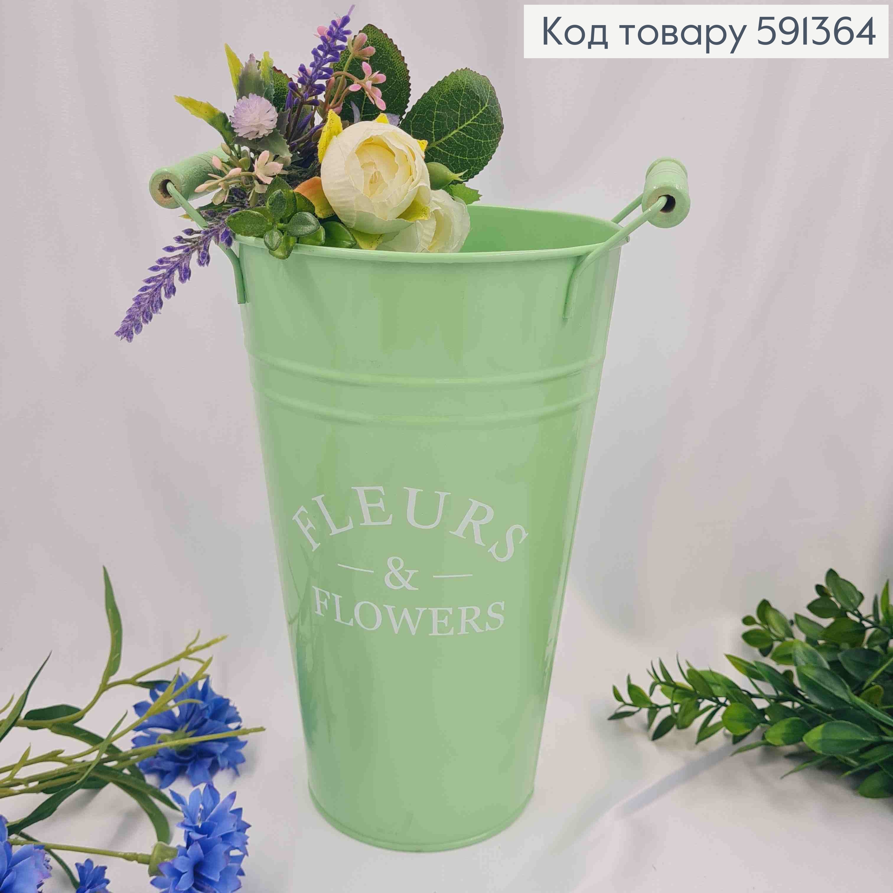 Відерце-кашпо, метал, салатового кольору, з написом "FLEURS&FLOWERS", висота 24см, Польща
