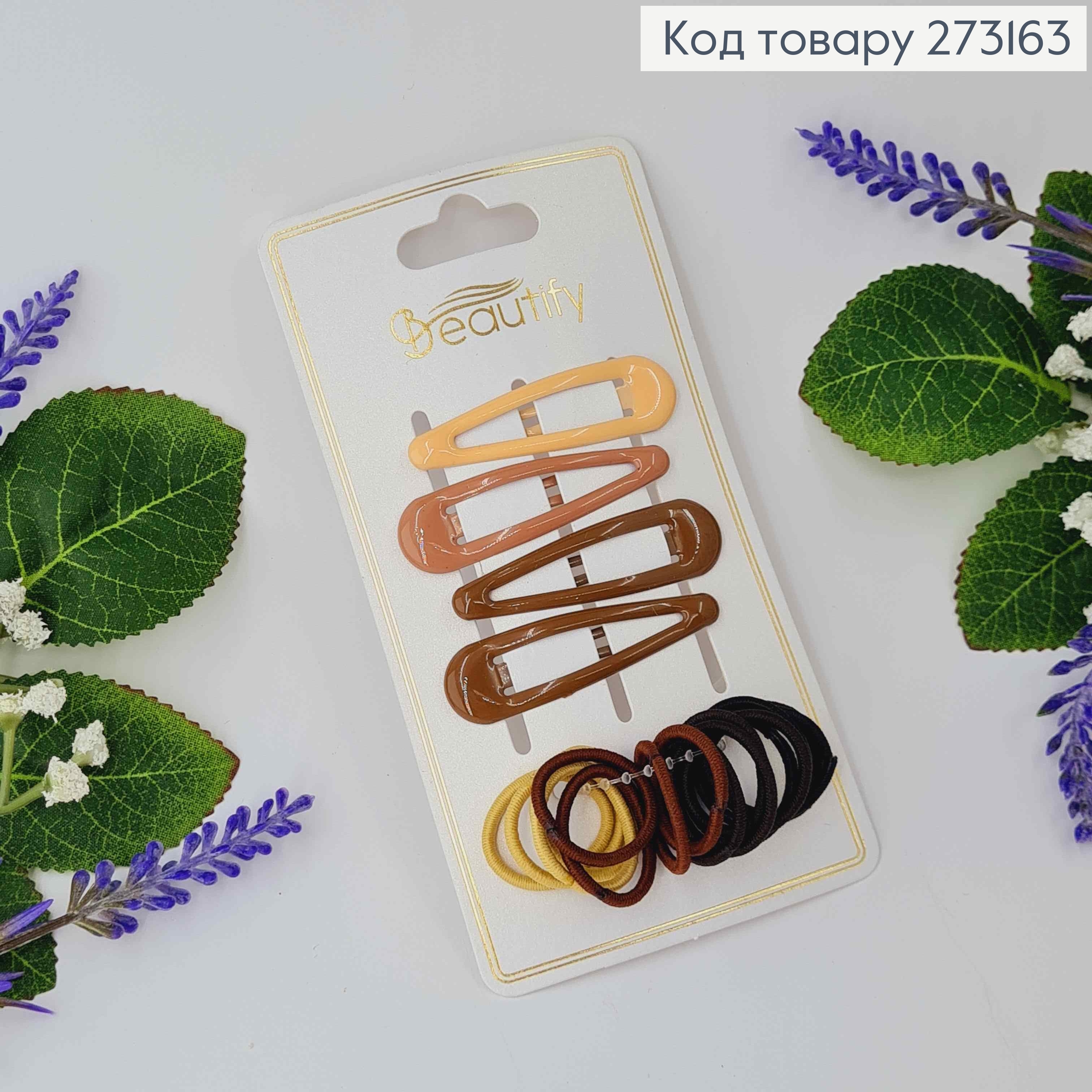 Заколки Тік-Так (4шт) 5см + резинки (16шт)2см, коричневих відтінків, Beautify.